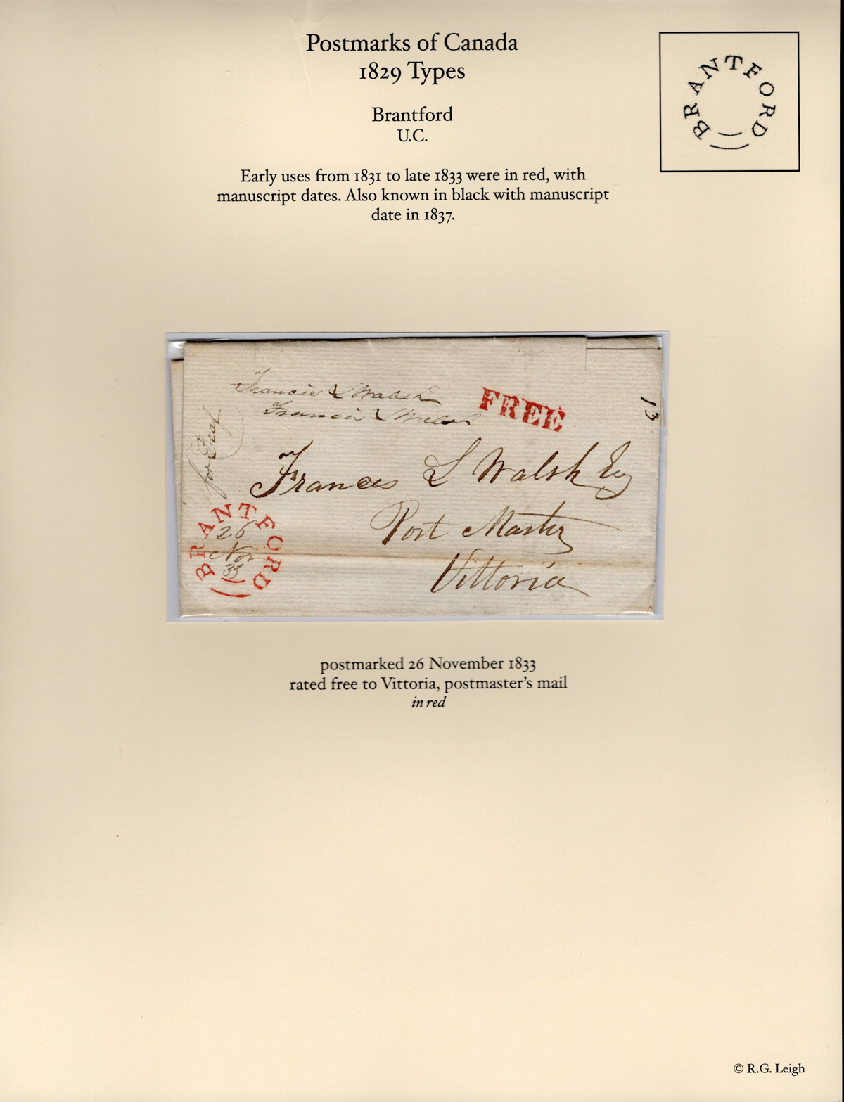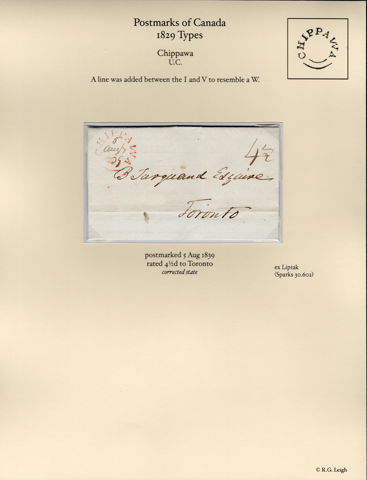 Folded Letter to Toronto, with the town spelling corrected by creating a W out of an I and a V, mailed on AUG.5.1839 (1829-type in red), very fine and scarce, with only a few known. Ex Liptak.
