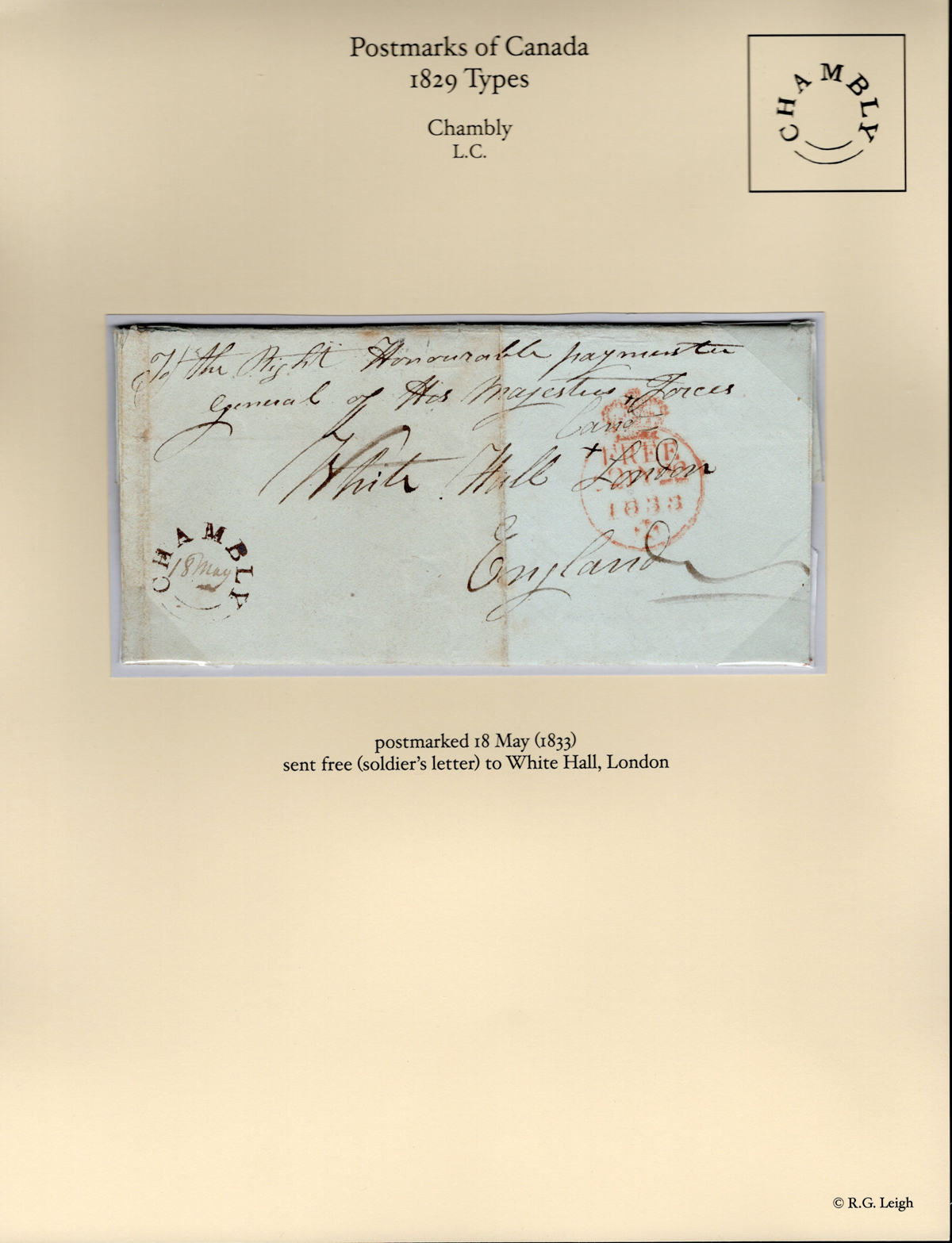 Folded Military Letter to England, letter inside is written by Corporal John Hughes and datelined "Chambilee", mailed on MAY.18.1833 (1829-type in black) to the "Right Honourable Paymaster General of His Majesty's Forces" in London. Mailed unpaid