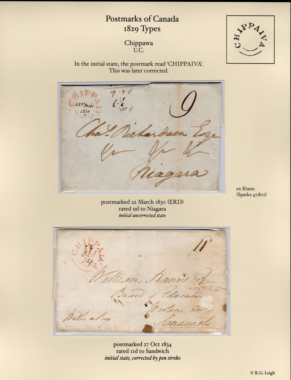 Chippaiva (U.C.) Two Folded Covers, both have the incorrect town spelling, first mailed on MAR.22.1830 (1829-type in red is the ERD) to Niagara, second mailed OCT.27.1834 (1829-Type in red) to Sandwich, overall fine to very fine.