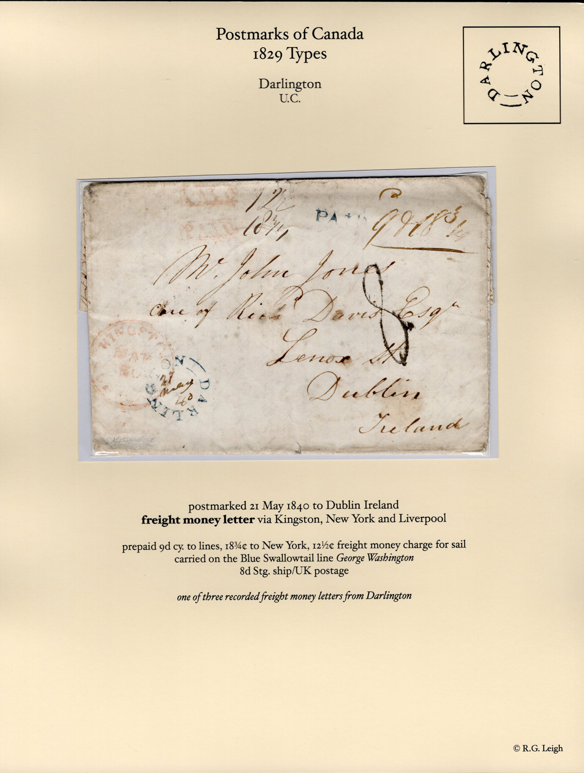 Folded Freight Money Letter to Ireland, mailed on MAY.18.1840 (1829-type in blue) to Dublin Ireland, via Kingston (MAY.30), New York and Liverpool, with boxed "LIVERPOOL / SHIP LETTER" on back and Dublin diamond JUL.2.1840 receiver, overall