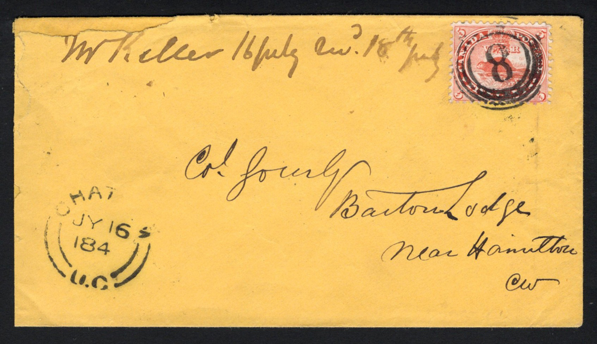 209 CVR   image5c Beaver on an 1864 Cover with 4-Ring #8 from Chatham U.C., mailed on JUL.16.1864 (Chatham double broken circle, missing a year slug) to "Barton Lodge, near Hamilton" (Hamilton JUL.18 receiver), franked with a 5c Beaver cancelled by a very fine 4-ring #8 cancel, small piece of backflap missing, still very fine overall.