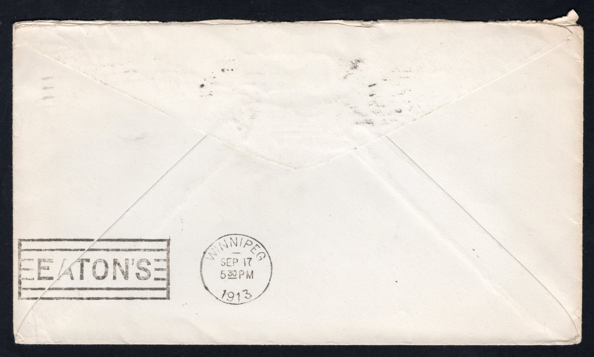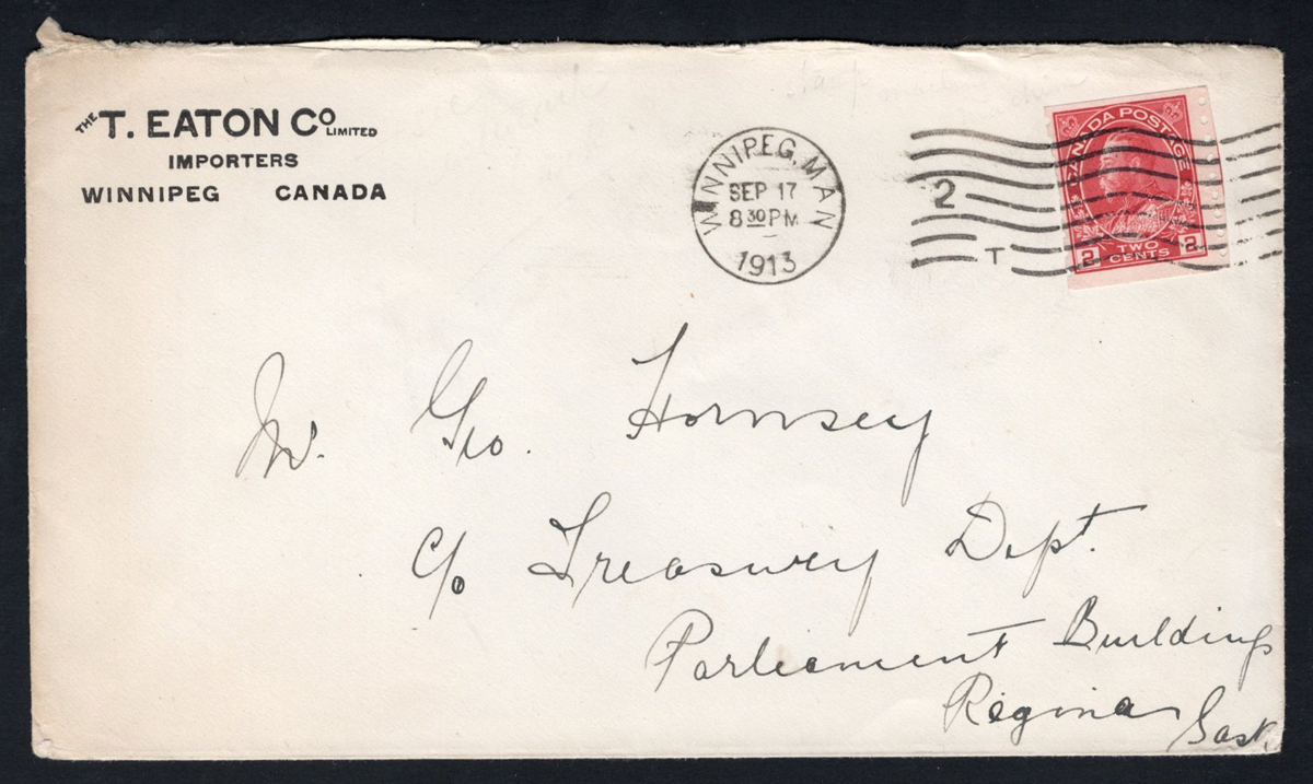 203 CVR   image1913 The Only Known Example of the Winnipeg “Eaton’s" Machine Cancel, a "T. Eaton & Co. Importers / Winnipeg" corner card cover mailed from Winnipeg on SEP.17.1913 (Int’l machine cancel ties a 2c carmine Admiral coil) to the Parliament Building in Regina, Saskatchewan. The back of the cover shows a very fine and complete strike of the so far unique “EATON’S” International slogan machine cancel, dated SEP.17.1913 (3 hours previous to the despatch cancel on front). Very fine, and a major Canadian postmark rarity (the earliest known slogan machine cancel in Canada), a must have for the serious machine cancel collector. The cover is illustrated and fully described in an article by Rob Leigh and Hugo Deshaye in the PHSC Journal No. 130 (p.18-19). (Scan 1) (Scan 2) (All Scans) (All Images)