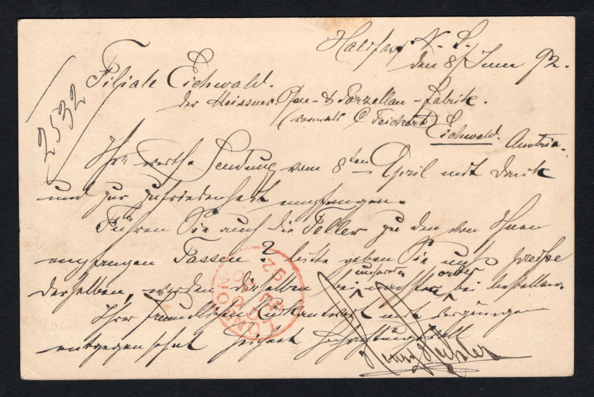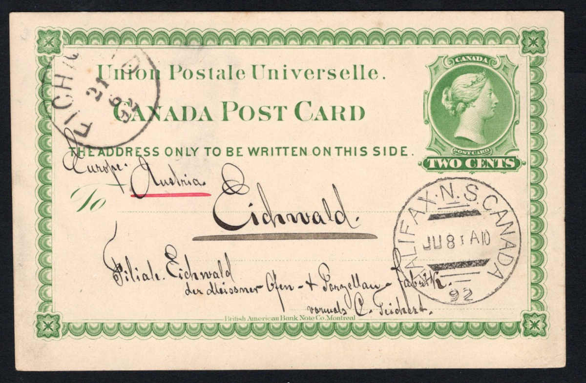 217 PC   image1892 Halifax NS Squared Circle on 2c U.P.U. Stationery Card to Austria, mailed by Henry Hechler (and signed by him on back) on JUN.8.1892 to Austria, with a JUN.21 receiver on front, with a London England JUN.20 transit in red on back, very fine. (Scan 1) (Scan 2) (All Scans) (All Images)