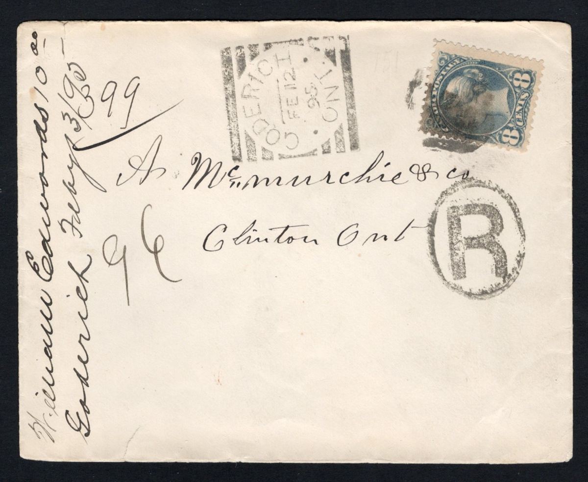 218 CVR   image1895 Goderich Ont. Squared Circle on an 8c SQ Registered Cover, mailed on FEB.12.1895 (free strike) to Clinton (next day receiver on back) and franked with a single 8c Small Queen, tied by a cork cancel. Very fine.