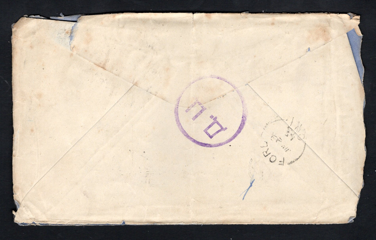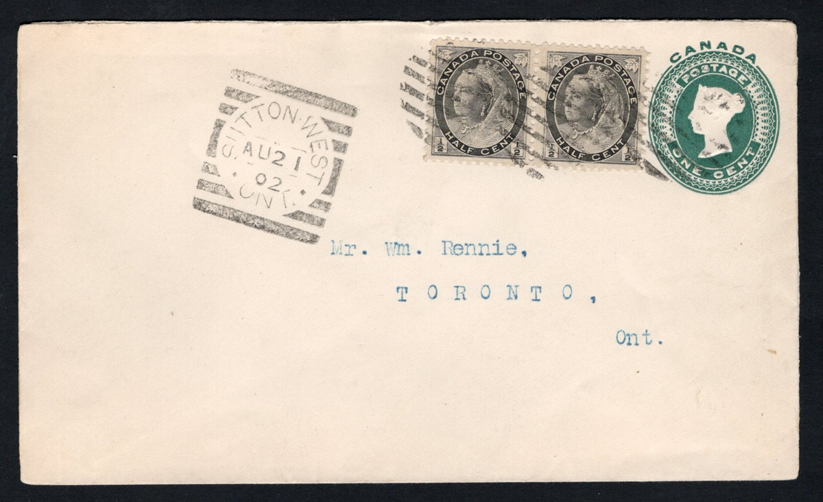 219 CVR   image1902 Sutton West Quebec Squared Circle on a Cover to Toronto, an uprated stationery envelope mailed on AUG.21.1902 (very fine free strike) to Toronto, with next day receiver on back, open on three sides, still very fine and clean.