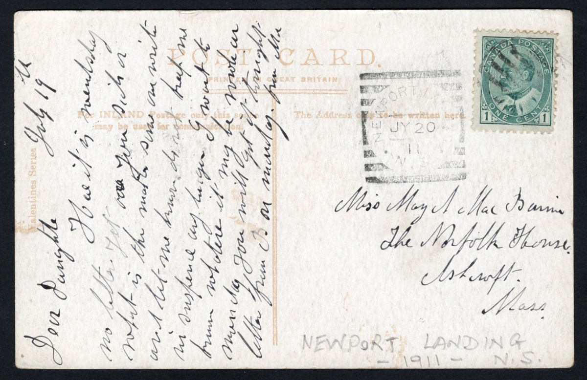 220 PC   image1911 Newport Landing N.S. Squared Circle on a 1c KEVII Picture Postcard, mailed on JUL.20.1911 (fine-very fine free strike) to Massachusetts, very fine. (Scan 1) (Scan 2) (All Scans) (All Images)