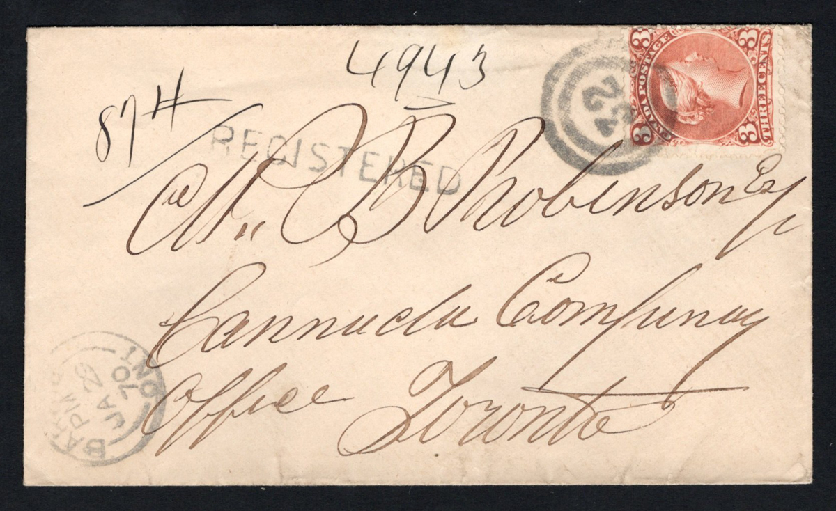 210 CVR   image3c Large Queen on an 1870 Registered Cover with 2-Ring #32, mailed from Barrie Ont on JAN.29.1870 (inner broken circle) to the Canada Company in Toronto (JAN.31 receiver). Franked with a single 3c Large Queen, tied by a 2-ring #32 cancel, paying the domestic letter rate (with the reg. fee paid in cash). Very fine and ex “Brouse find”.