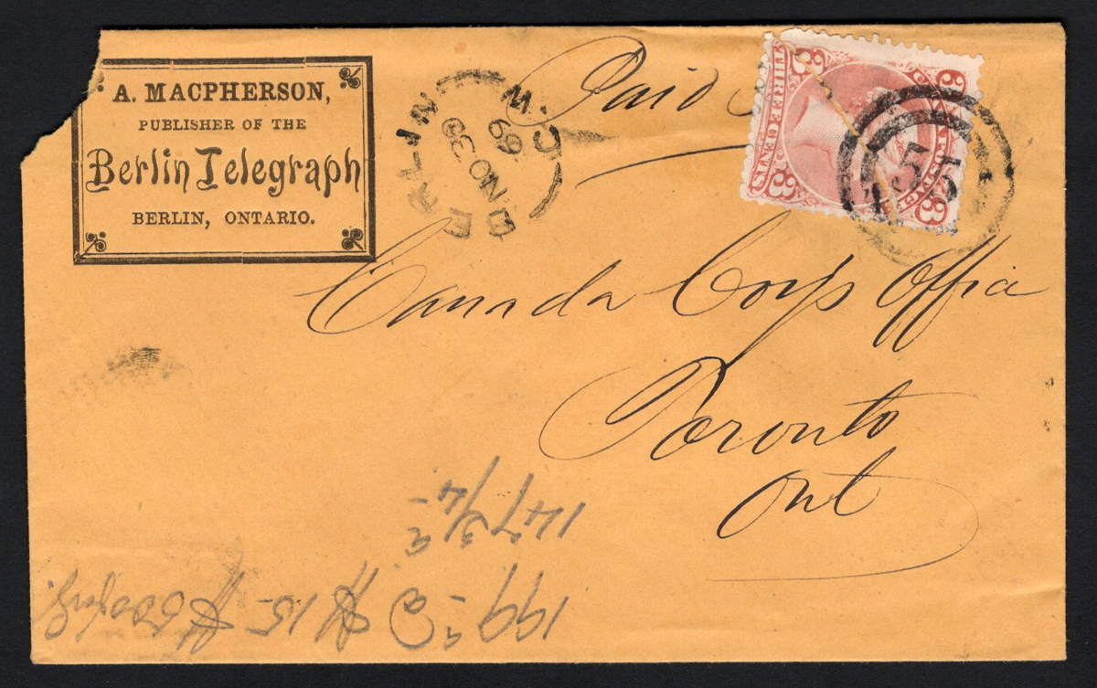 216 CVR   image3c Large Queen Cover with 2-Ring #55 from Berlin, a “A MacPherson / Publisher of the Berlin Telegraph” corner card cover mailed from Berlin C.W. on NOV.30.1869 (broken circle free strike) to the Canada Company in Toronto (NOV.30 receiver), franked with a 3c Large Queen, tied by a neat 2-ring #55 (RF 7 on LQ cover). Small corner piece missing at upper left and stamp split in half before application, else very fine appearance and ex the “Brouse find”.