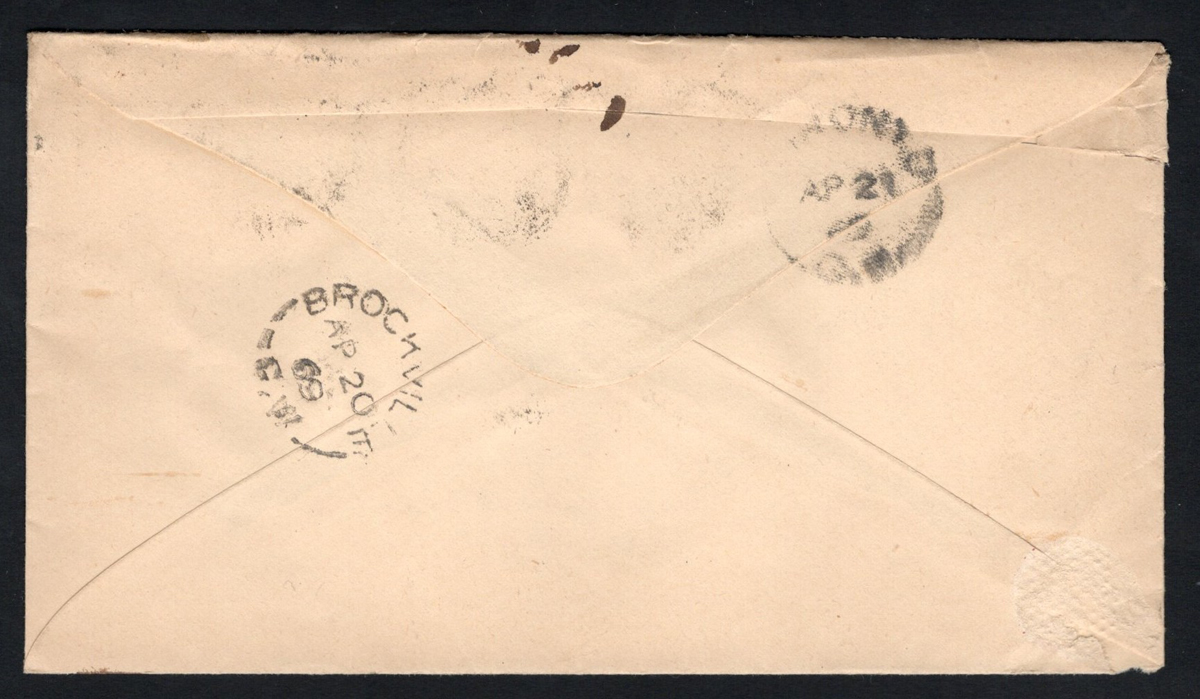211 CVR   image3c Large Queen on an 1869 Registered Cover with 4-Ring #44, mailed from Smiths-Falls U.C on APR.20.1869 (very fine double broken circle) to the Canada Company in Toronto (APR.21 receiver) via Brockville (APR.20). Franked with a very fine single 3c Large Queen, tied by a 4-ring #44 cancel, paying the domestic letter rate (with the reg. fee paid in cash). Very fine and ex “Brouse find”. (Scan 1) (Scan 2) (All Scans) (All Images)