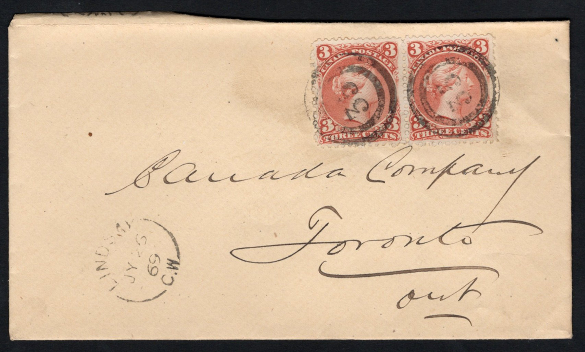 212 CVR   imagePair of 3c Large Queens on Cover with 2-Ring #35, mailed from Lindsay on JUL.26.1869 (broken circle free strike) to the Canada Company in Toronto (JUL.28 receiver), franked with a horizontal pair of 3c Large Queens (possibly paying a double weight rate), tied by two 2-ring #35 cancels. Very fine and ex “Brouse find”.
