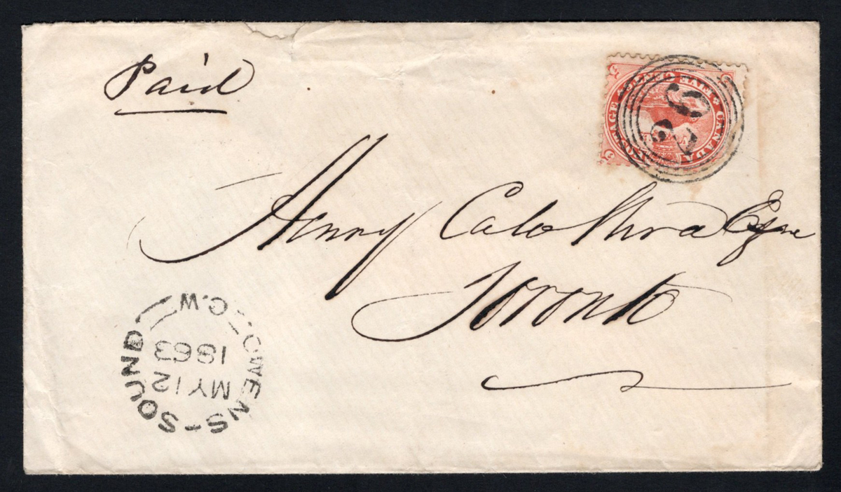 214 CVR   image5c Beaver on an 1863 Cover with 4-Ring #26 from Owens Sound C.W, mailed on MAY.12.1863 (double broken circle) to Toronto (next day receiver), franked with a (faulty) 5c Beaver tied with a very fine strike of the 4-ring #26 cancel. Fine and ex “Brouse find”.