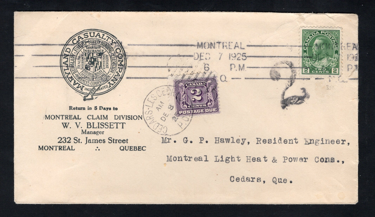 208 CVR   image1925 (Dec. 7) Montreal Type 8a-3 Lamoureux Cancel on Postage Due Cover, a very fine and complete impression dated on the LRD for this type, on an illustrated "Maryland Casualty Company" 2c Admiral cover to Cedars, Québec. Montréal purple double circle transit on back, assessed "2" due handstamp and with a 2c violet Postage Due (#J2), tied by a very fine DEC.8.1925 Cedars - Les Cedres / P.Q. duplex (the new ERD), a very fine and attractive cover. Leigh reports (on the PHSC website) 18 examples of this postmark. (Scan 1) (Scan 2) (All Scans) (All Images)