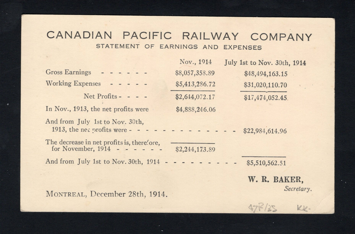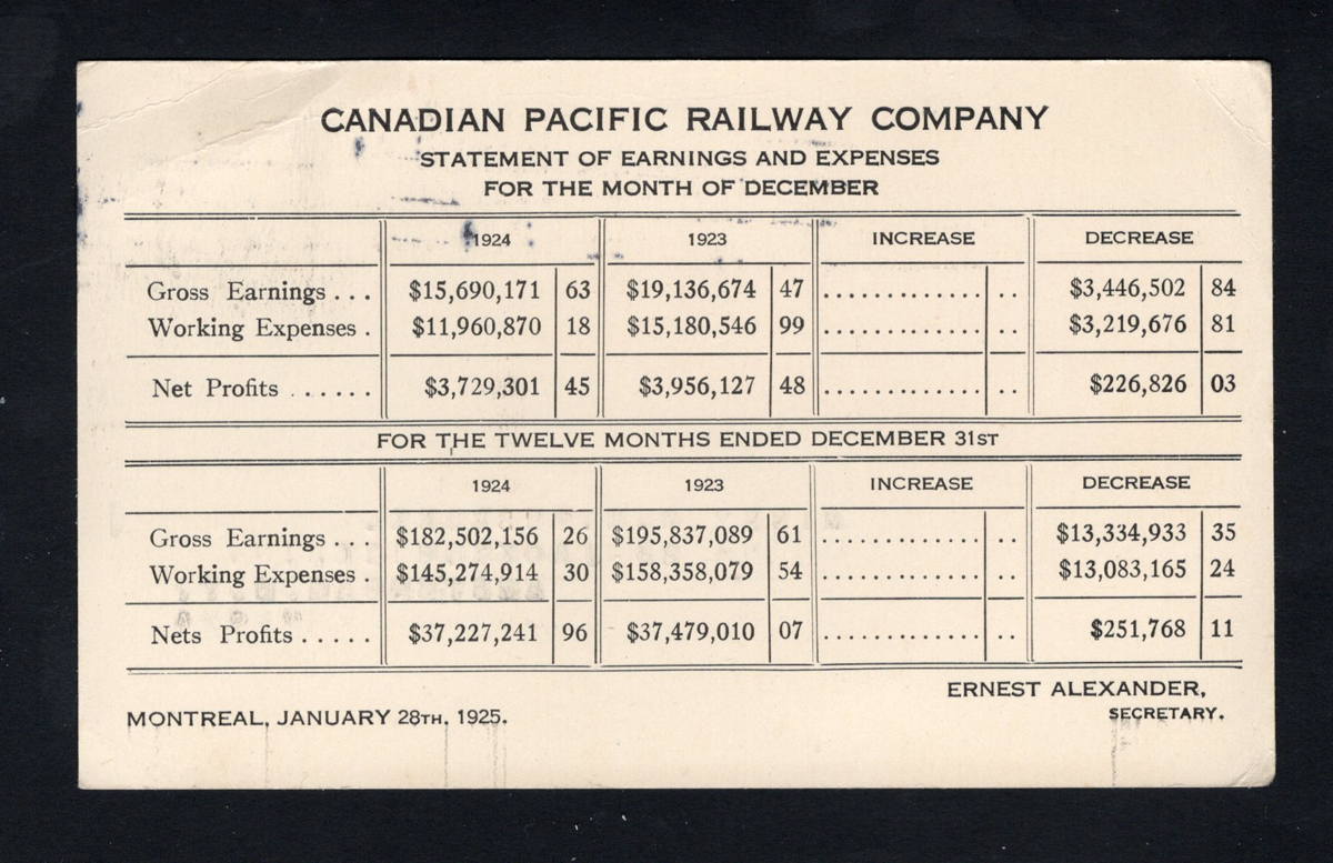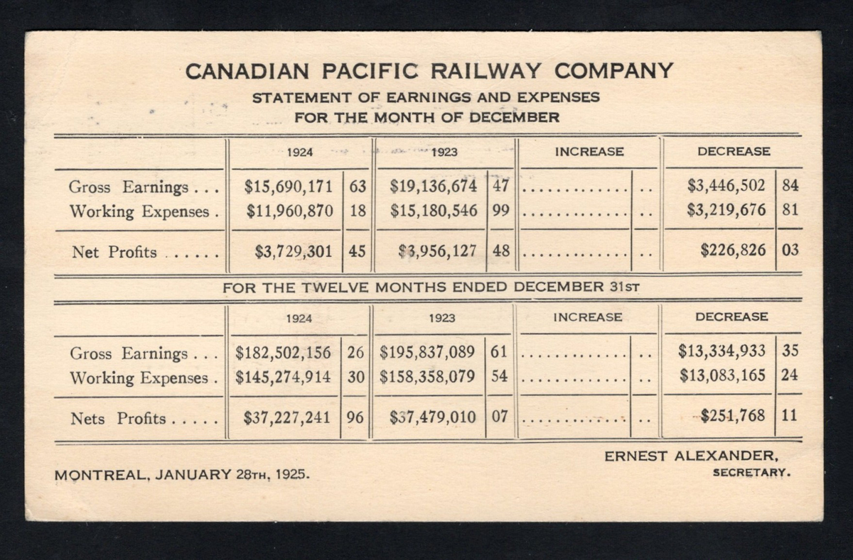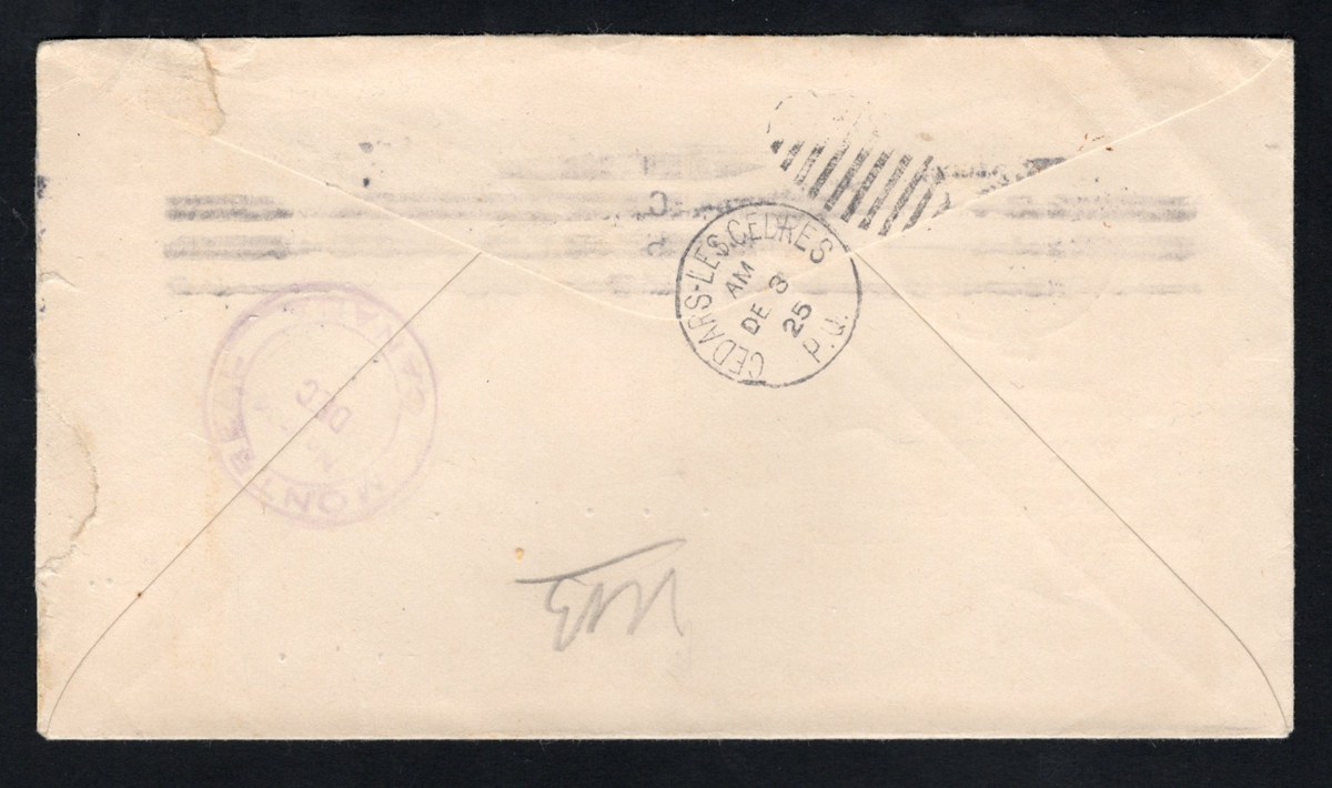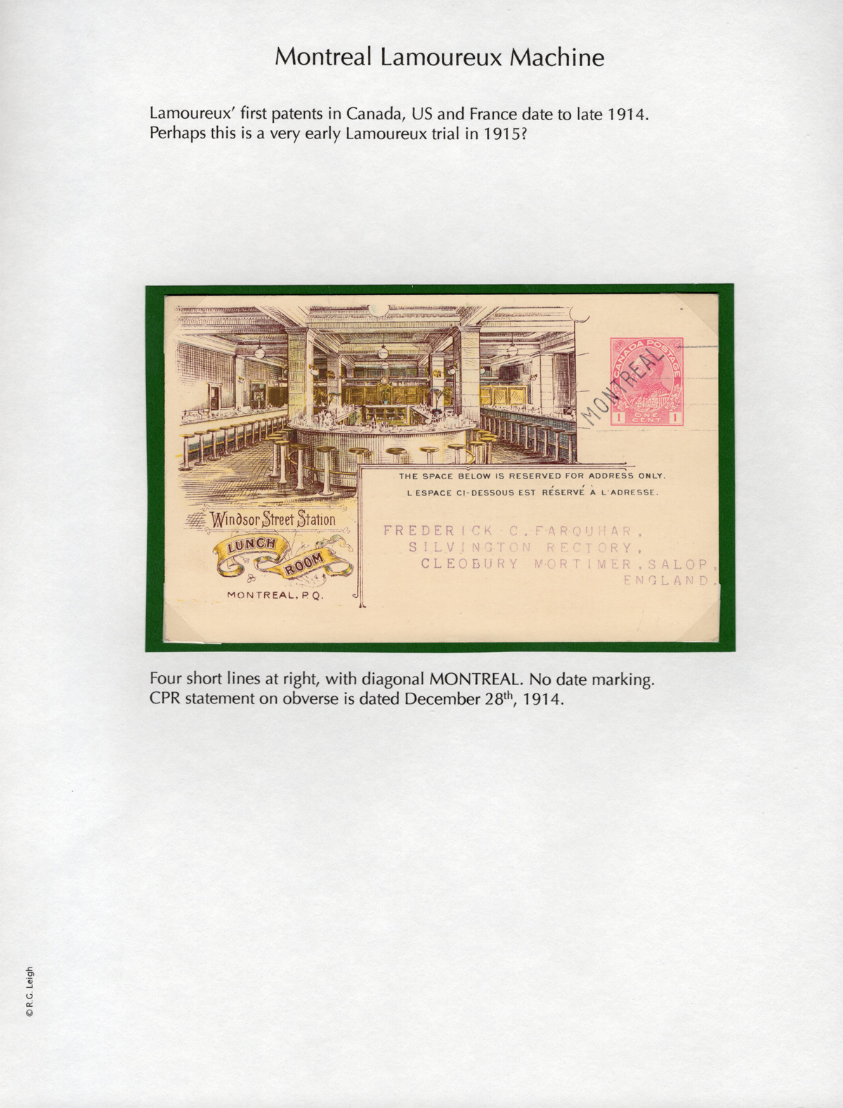 204 PC   image1914 (Dec. 28) Early Experimental Montréal Lamoureux on an Admiral Windsor Street Station Illustrated Card, a very fine undated strike (four short lines with a diagonal "MONTREAL" between them) mailed on DEC.28.1924 (dated financial statement on back) on a 2c Admiral "Windsor Hotel Station Lunch Room, Montréal, P.Q." bi-colour illustrated CPR card, very fine. Unlisted, and Leigh assesses this may be an early (the earliest) Lamoureux, based on the fact that their patents date to late 1914s. Also, being on a card typically found with Lamoureux cancels, there is a strong possibility that this is the earliest Lamoureux postmark. Very fine, and so far unique. (Scan 1) (Scan 2) (All Scans) (All Images)
