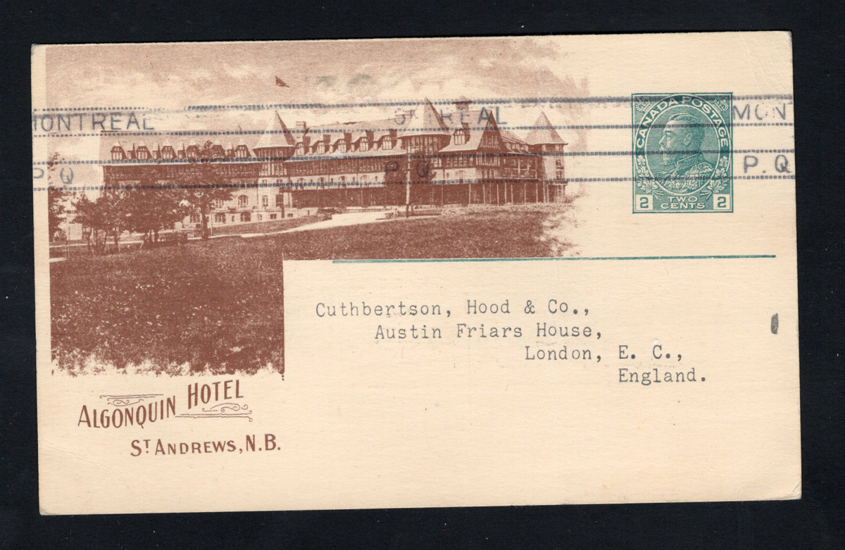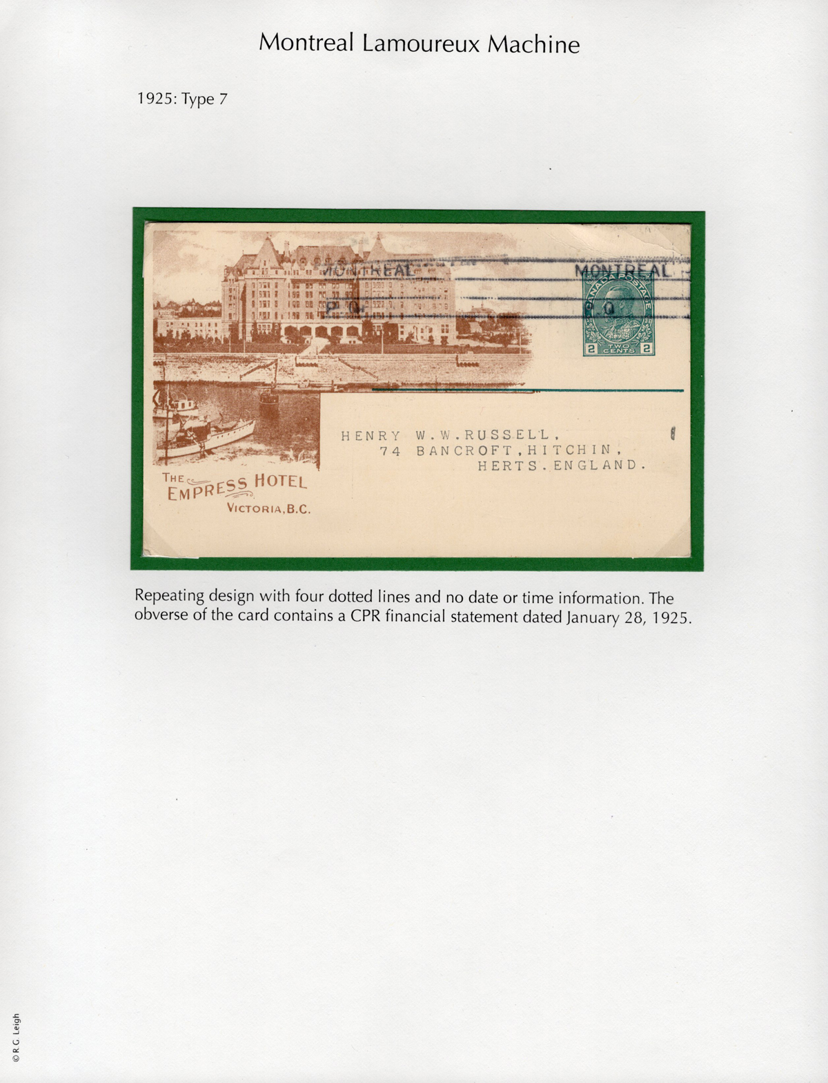 207 PC   image1925 (Jan. 28) Montreal Lamoureux (Type 7) Postmark on an Illustrated Admiral C.P.R. Card, a 2c Admiral "Algonquin Hotel, St Andrews N.B." card to England, with a very fine strike of this scarce machine postmark. Undated, but Statement of Earnings on back is dated JAN.28.1925. Leigh reports (on the PHSC website) 10 examples, plus this one makes 11. Very fine. (Scan 1) (Scan 2) (All Scans) (All Images)