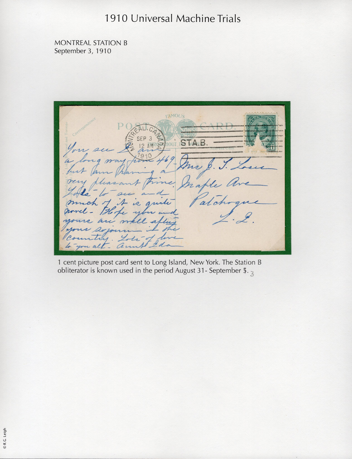 202 PC   image1910 (Sep. 3) Montréal Universal Machine Trial, a very fine strike dated SEP.3.1910, the latest of only three examples recorded for Montréal on a 1c King Edward VII picture postcard to Long Island NY. Stamp is damaged, still a very fine strike of this rare trial postmark.