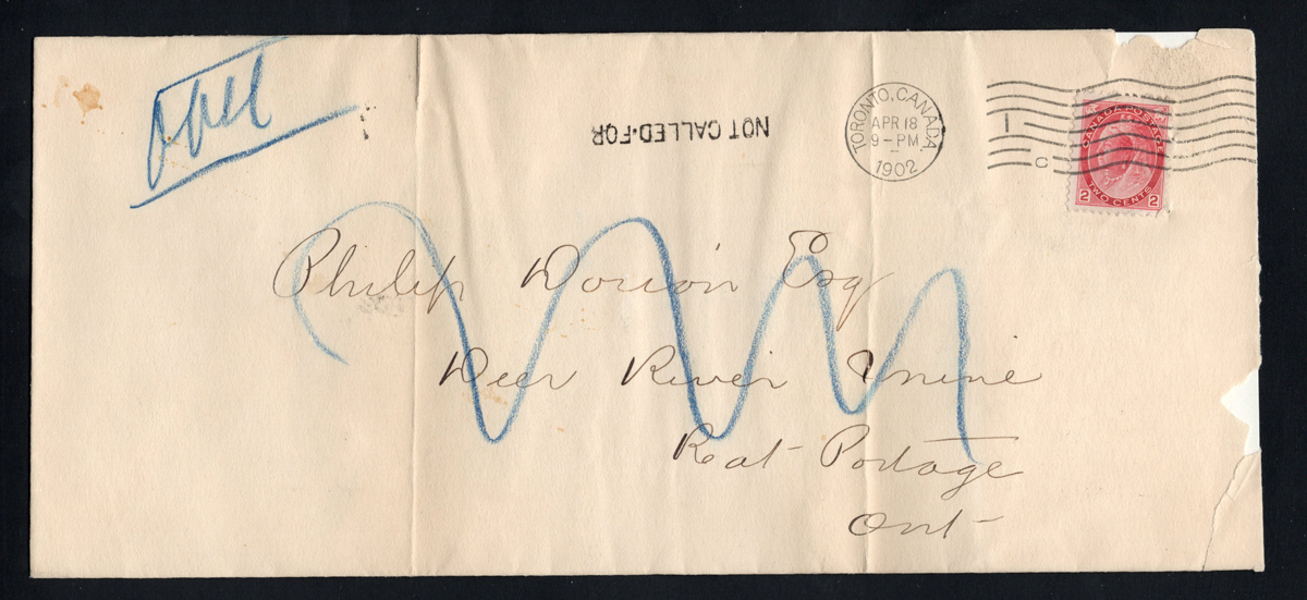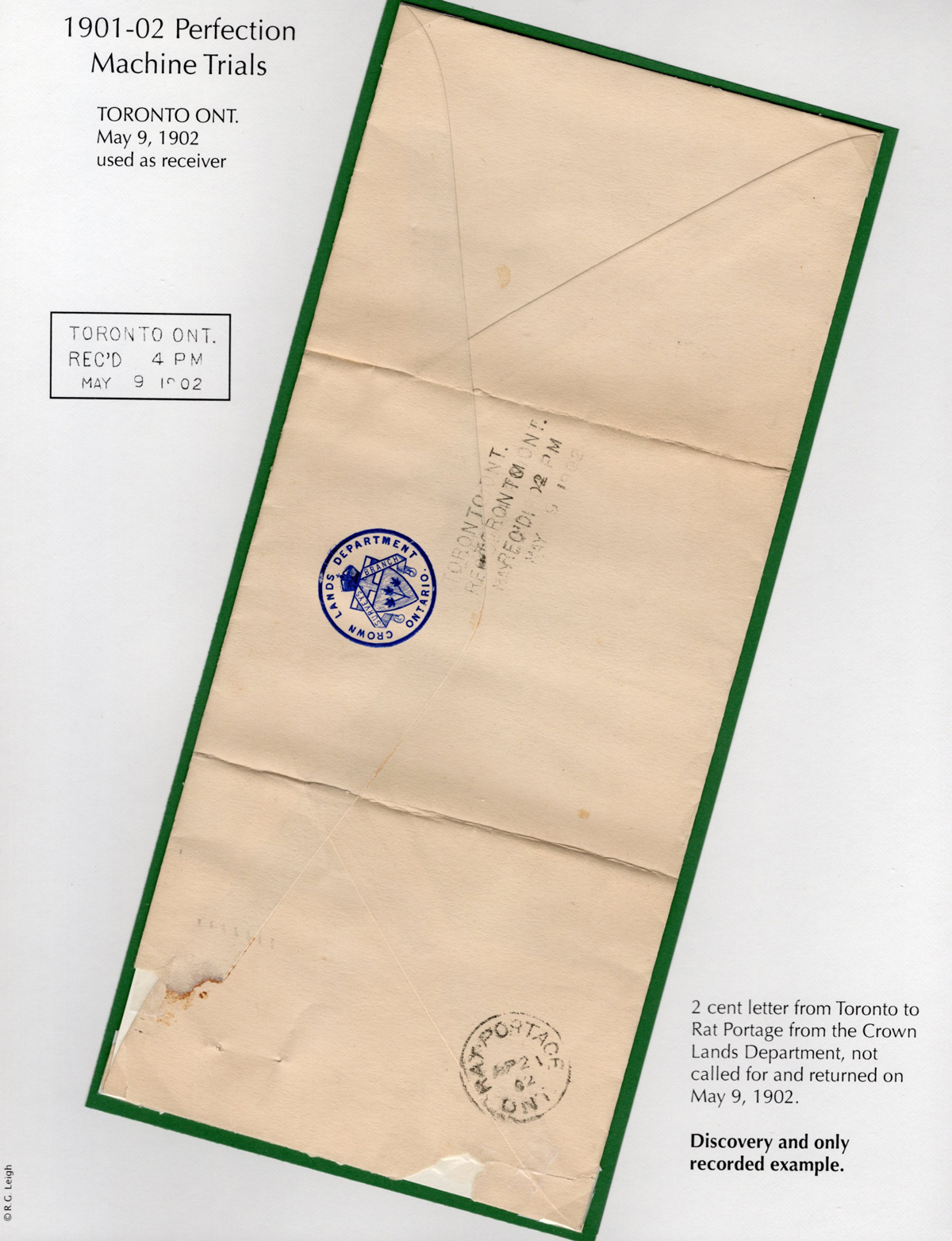 201 CVR   image1902 (May 9) Unique Toronto Perfection Machine Trial, a boxed "TORONTO ONT. / REC'D 4 PM / MAY 9 1902" strike used as a receiver on back of a "Crown Lands Department" 2c Numeral cover mailed from Toronto (APR.18.1902) to Rat Portage (APR.21 receiver) with "NOT CALLED FOR" and returned. Tears and creases, still the discovery, and only recorded example from Toronto. (Scan 1) (Scan 2) (All Scans) (All Images)