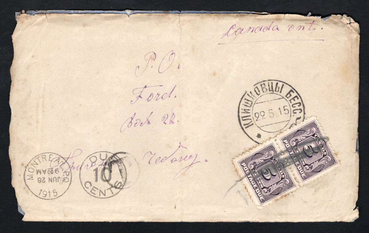 205 CVR   image1915 International Machine Postage Due on Cover, with a long letter still inside, mailed in Russia on MAY.22.1915 to Canada (JUN.29.1915 Ford, Ont receiver on back) with a vertical pair of the 5c purple Postage Due issue applied on arrival, with "T" in circle as well as a rare impression of the International machine "Montreal P.Q. / DUE 10 CENTS" with inverted "JUN 26" date, as well as a couple (on front and back) of postmarks in Cyrillic. Open on all four sides, still as far as we know there are only a few of these known, all on incoming covers from Russia. (Scan 1) (Scan 2) (All Scans) (All Images)
