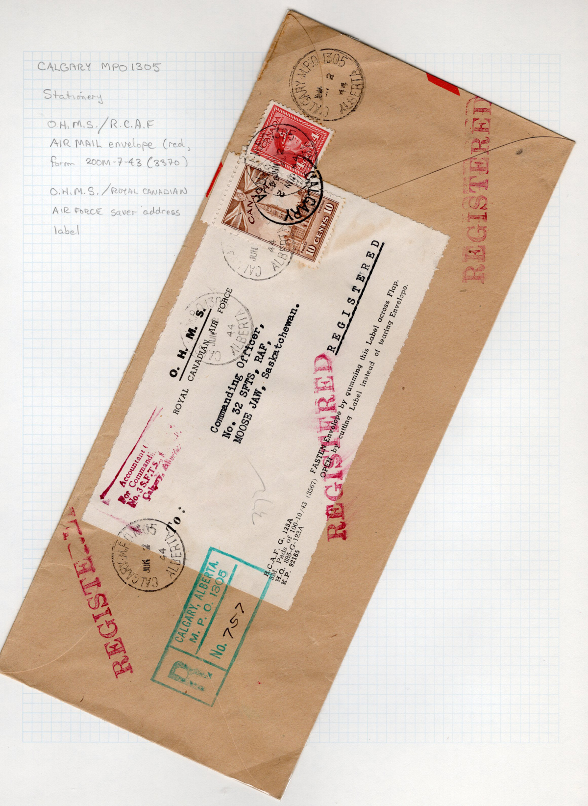 1305 Registered O.H.M.S. Cover, a Royal Air Force cover mailed on JUN.2.1944 (5 c.d.s. strikes, two tie the two stamps) to Moose Jaw, Sask. via Calgary (JUN.2 c.d.s.), with a "Calgary M.P.O. 1305" registration box in green, very fine.