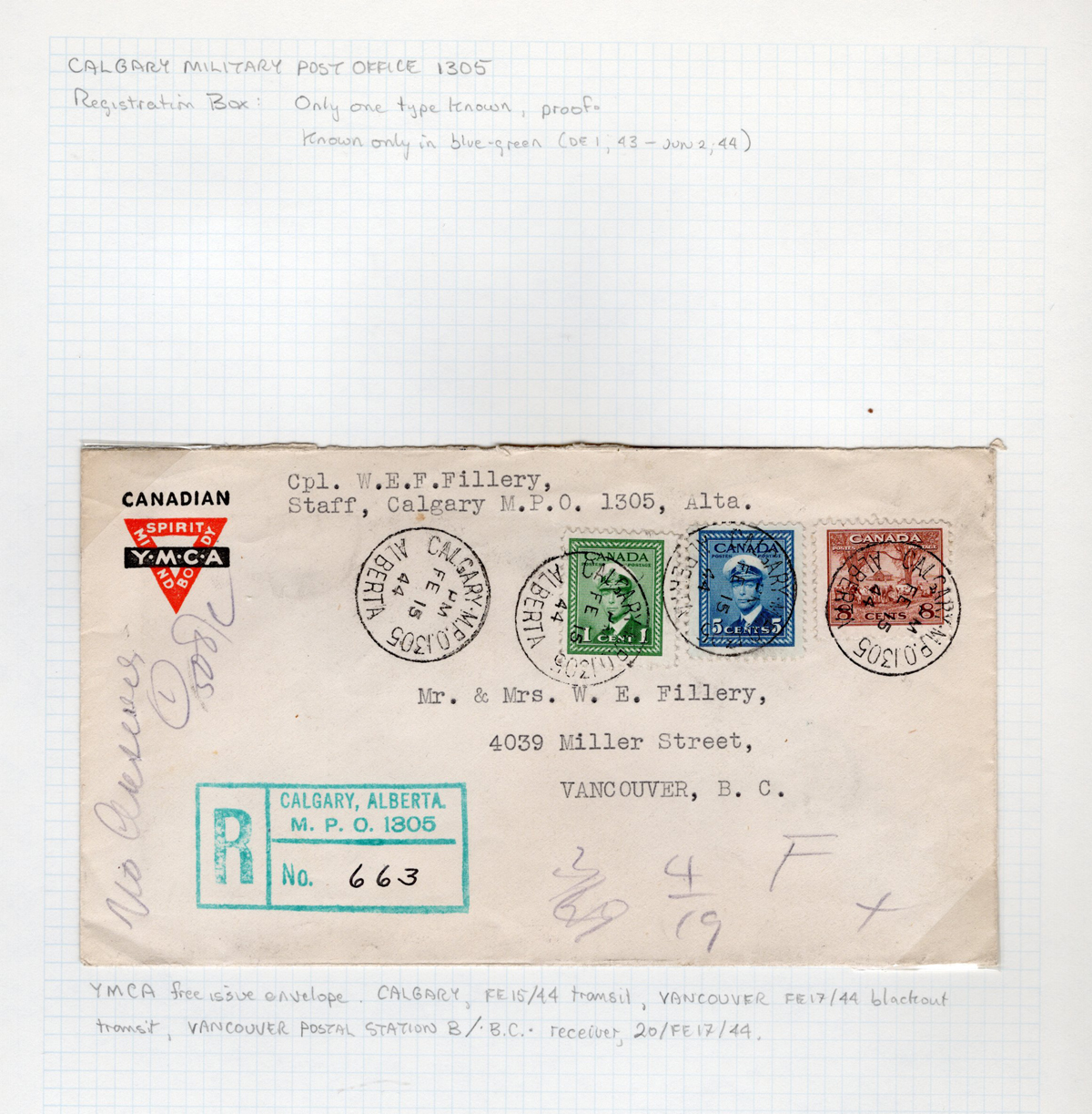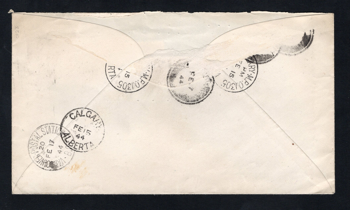1305 Registered Cover, mailed on FEB.15.1944 (4 c.d.s. cancels, 3 of which tie 3 stamps) to Vancouver (FEB.17 blackout transits and FEB.17 Station B receiver) via Calgary (FEB.15 transit), part of backflap missing, else very fine. (Scan 1)
