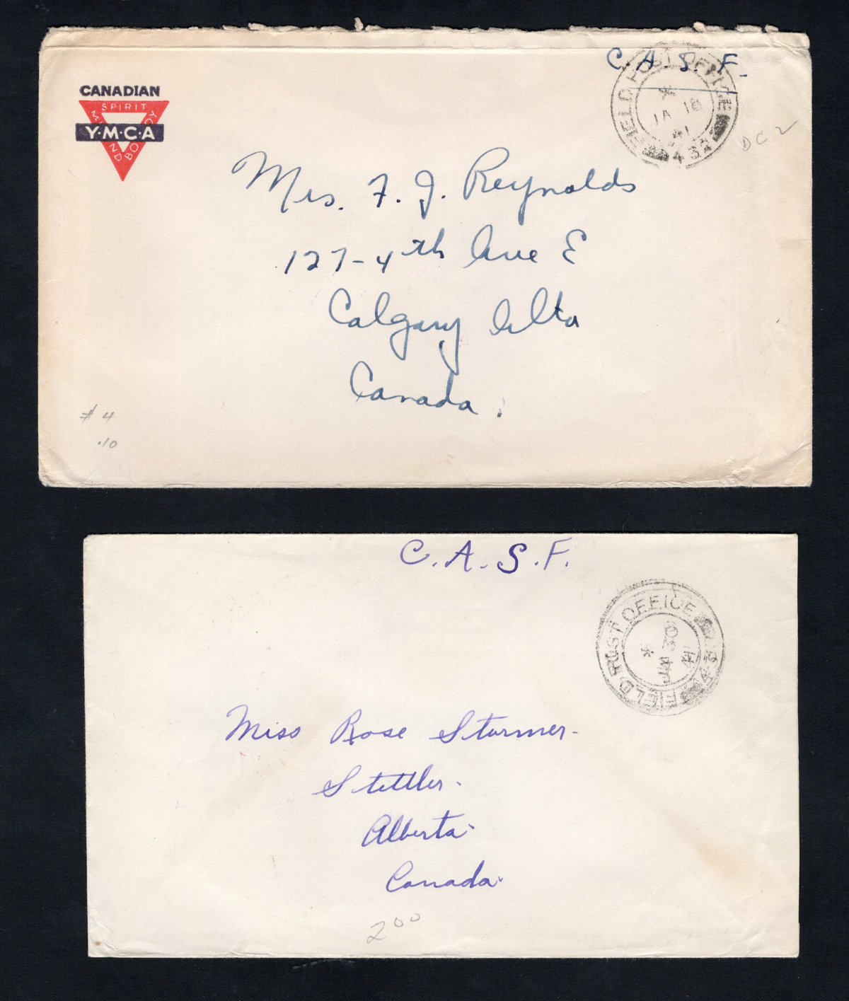 Highlanders C.A.S.F. Battalion Orderly Room Postmarks on Two Covers, first is a Y.M.C.A. cover mailed to Calgary on JAN.18 (F.P.O. 432 despatch) and a "Knights of Columbus / War Services" cover mailed to Stettler, Alberta on JAN.30 (F.P.O.