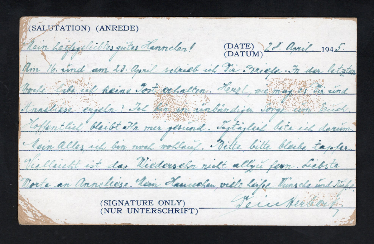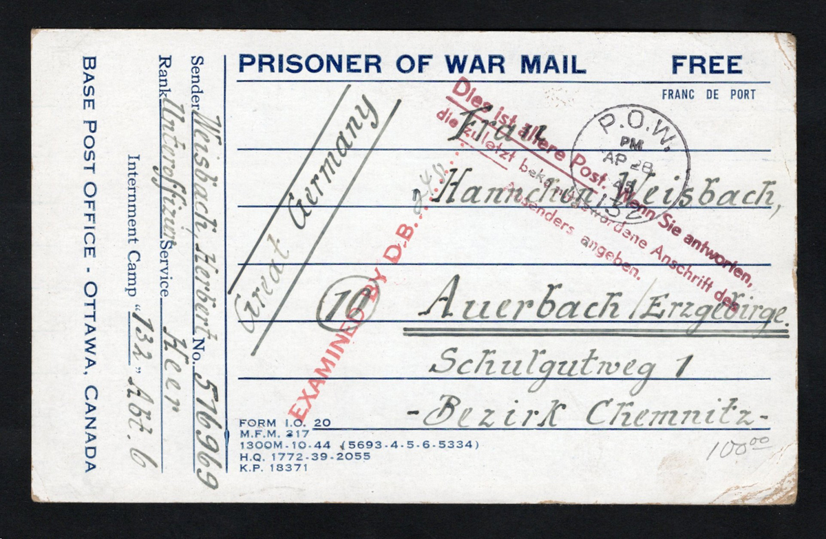 Prisoner of War Censored Card, mailed on APR.28.1945 from Camp 132 (c.d.s. despatch from Medicine Hat Camp) to "Great Germany", with two censor handstamps on front, and would have arrived after the end of the War. Edge wear, else scarce. (Scan 1)