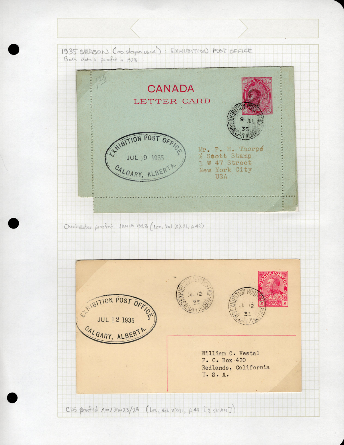 Exhibition Post Office Postmarks on Two Stationery Items, with a 2c on 3c QV surcharges letter card and a 2c KGV postal card, each with an Exhibition c.d.s. and large oval datestamp, dated JUL.9.1935 and JUL.12.1935 respectively, very fine.