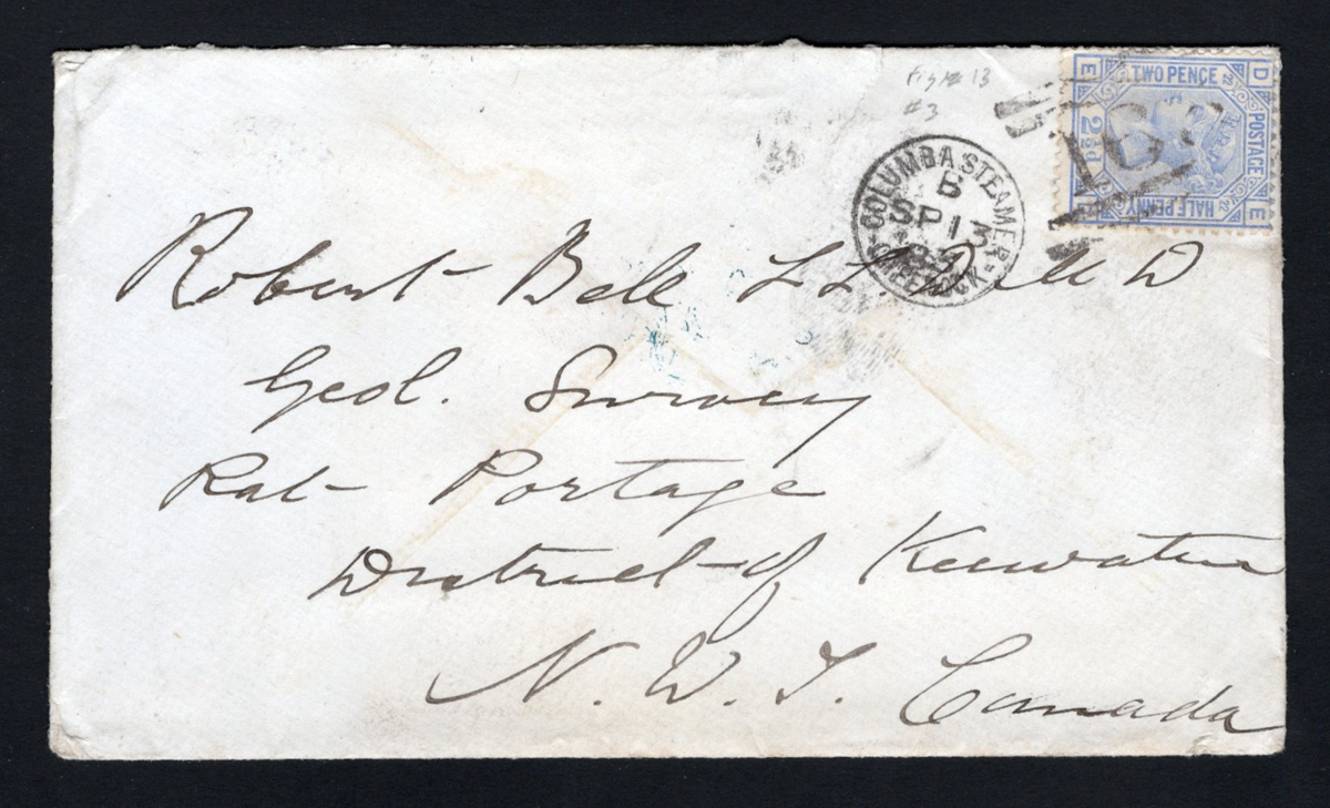 305 CVR   image1883 Incoming Cover to Rat Portage, Keewatin District, mailed from Innelland, Scotland on SEP.13.1883 (c.d.s. on back), with "Greenock / Columba Steamer" duplex dated SEP.13.1883 tying a 2½d QV stamp, addressed to Robert Bell (Geological Survey) in Rat Portage, N.W.T. (with Rat Portage / KEE SEP.26.1883 receiver). Small piece of backflap missing, still a rare combination. (Scan 1) (Scan 2) (All Scans) (All Images)