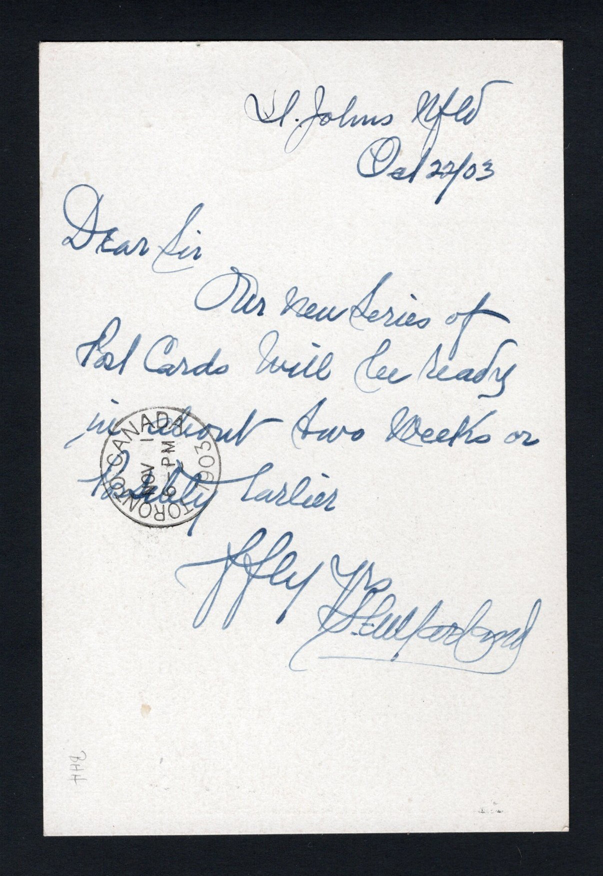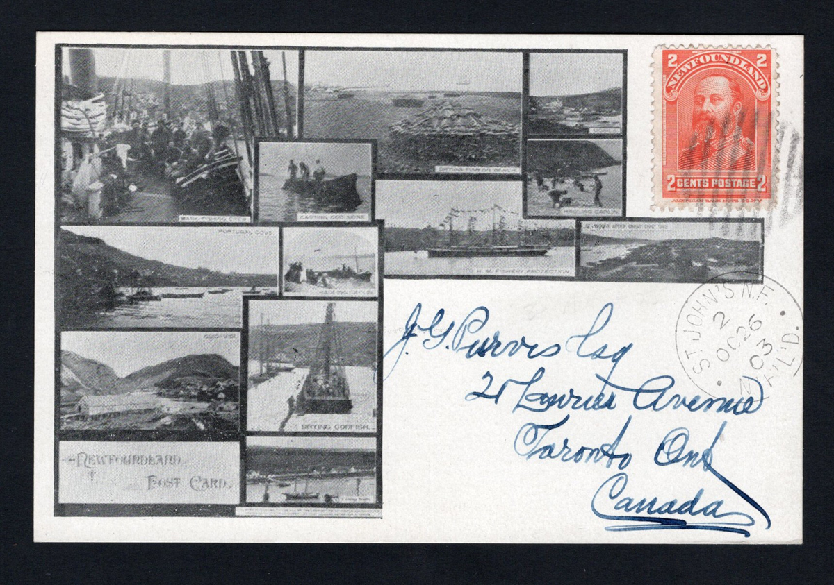 303 PC 82 image2c King Edward VII on a 1903 Picture Postcard to Canada, mailed from St John’s on OCT.26.1903 (c.d.s. free strike on picture side) to Toronto (NOV.1 machine hub receiver on message side), franked with a 2c vermilion KEVII tied by a circular grid cancel. The picture side shows many views of Newfoundland ships, harbours, etc., and the message side appears to have been written by the postcard’s printer. Very fine and fresh, a rare card. (Scan 1) (Scan 2) (All Scans) (All Images)