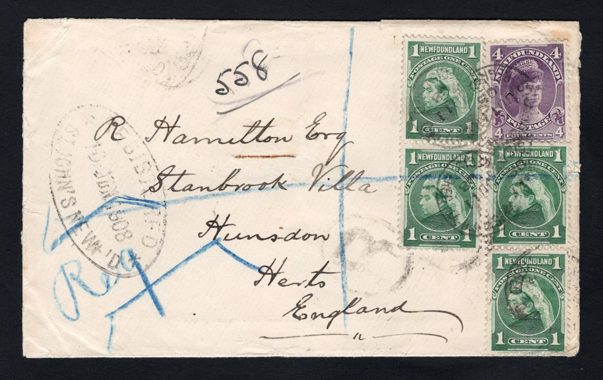 302 CVR 80, 84 image1908 Double Weight Registered Cover to England, mailed from St John’s on JUN.10.1908 (large registration oval) to Hudson England (JUN.20 receiver) via Liverpool (oval transit) and Warf (JUN.20). Franked with a 4c violet Duchess of York and four 1c green Queen Victorias (all tied to each other by St John’s c.d.s.), which appears to underpay the 5c registration fee plus the double 2c per ounce rate, which should have been 9c. Tears on the backflap and light vertical crease, still very fine.