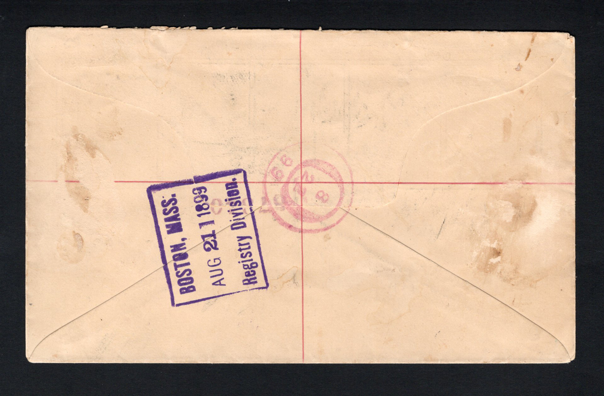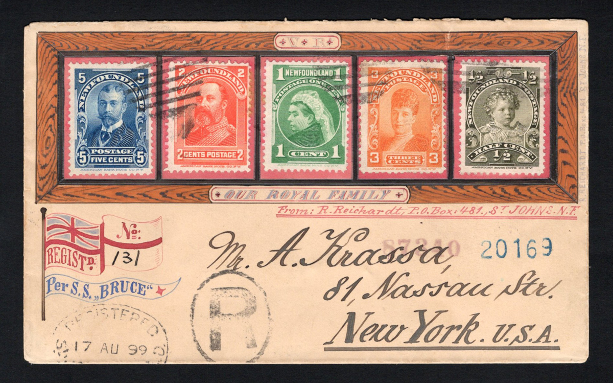 301 CVR 78/85 image1899 E.R. Krippner Hand Illustrated Registered Cover to New York, mailed registered from St. John’s on AUG.17.1899 (oval registration datestamp) to New York City (AUG.22.1899 receiver) via Boston (AUG.21 transit). A nicely illustrated “Flag and Frame” “per S.S. Bruce” cover franked with 5 different Royal Family issues, each tied by a light grid cancel. There is a neatly written notation reading “From: R. Reichardt, P.O. Box 481, St Johns, N.F.”. Very fine, scarce and ex Motson. (Scan 1) (Scan 2) (All Scans) (All Images)