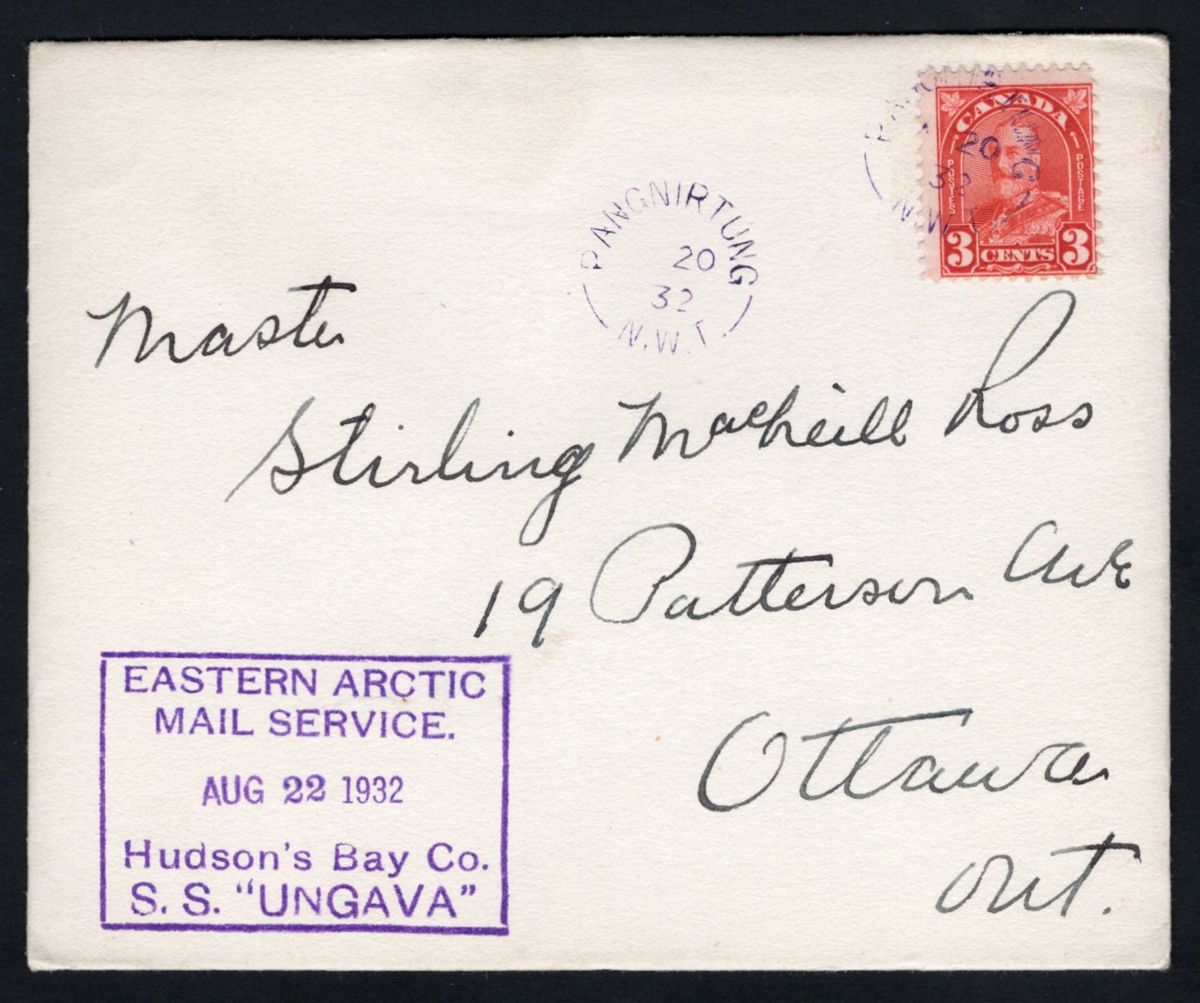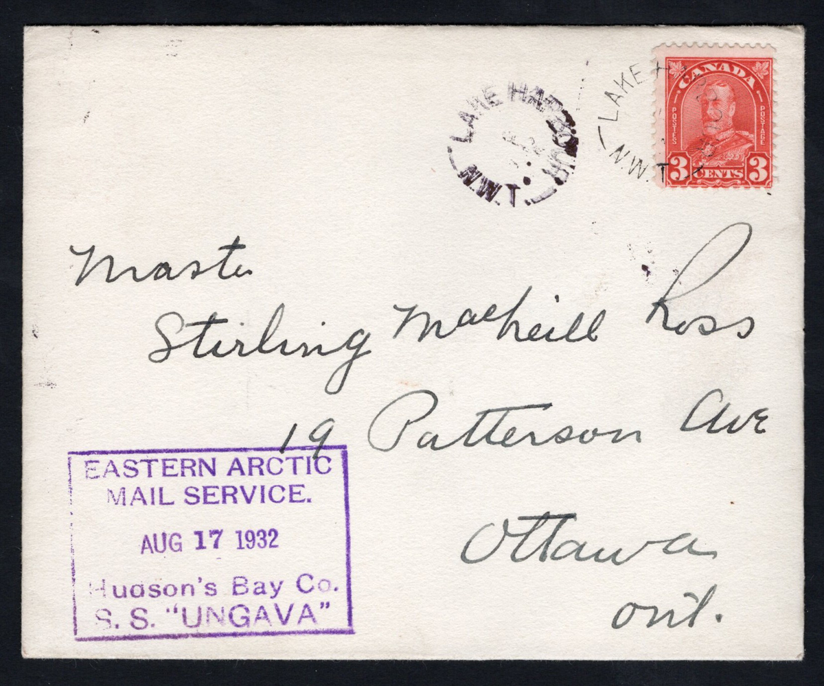 318 CVR   image1932 Lake Harbour to Ottawa, via the S.S. Ungava, a 3c KGV Arch is tied by a Lake Harbour N.W.T. town cancel (plus another free strike) on a cover to Ottawa, picked up by the S.S. Ungava on AUG.17.1932 (boxed datestamp in purple). Inside is a Christmas greetings card from the Fourth Hussars of Canada, with their crest. Opened rough at top, else very fine. This cover / card was mailed by the Royal Train Postmaster G.W. Ross (who was in the Fourth Hussars of Canada) to his son Stirling in Ottawa. The next four lots are covers that were mailed to his other son Roderick (4 of those are unopened and appear to contain the same greetings card). These 5 were consigned to us by the 1939 Royal Train Postmaster’s granddaughter, who also consigned some very interesting and unique material from the Royal Train Post Office (see our next general sale). Col. G. W. Ross, OBE, VRD (Ret’d) served in the Boer War with the 6th Battalion, Canadian Mounted Rifles, and later in both World Wars with the Canadian Army Postal Corps. Appointed Director of Railway Mail Services in 1929, he also served as Postmaster on the 1939 Royal Train during the tour of King George VI and Queen Elizabeth. He postponed his 1950 retirement to establish mail services for Canadian forces in Korea and for NATO deployments in Europe, capping a lifetime of distinguished service.