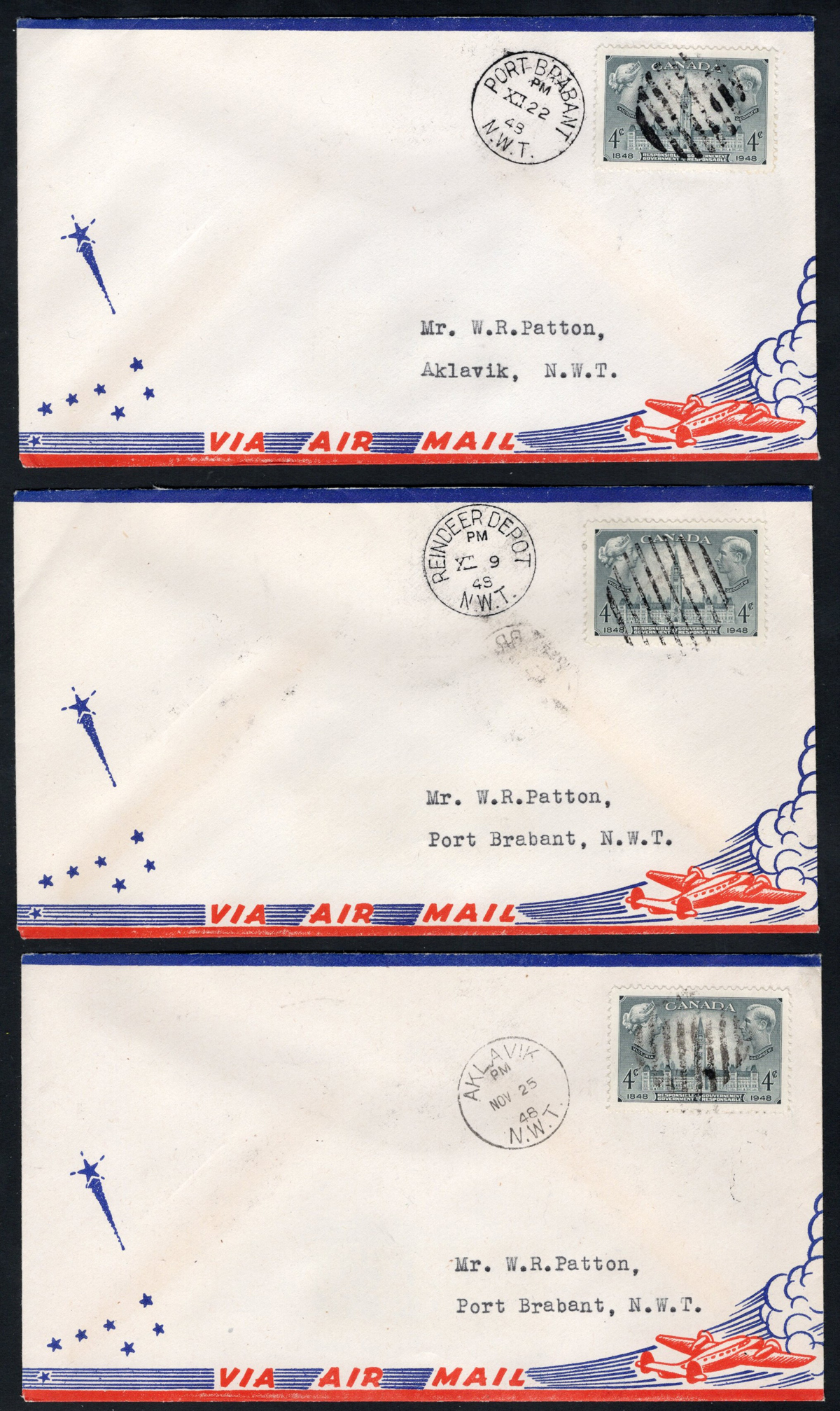 307 CVR   image1948 Three Scarce Northwest Territory Covers, all three on 4c Responsible Government airmail covers with the appropriate receiver on back, Aklavik to Port Brabant (NOV.25), Reindeer Depot to Port Brabant (DEC.9) and Port Brabant to Aklavik (DEC.22), very fine and scarce postmarks.