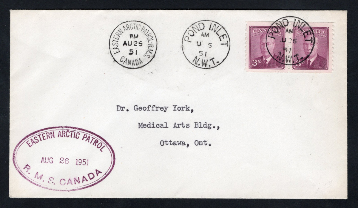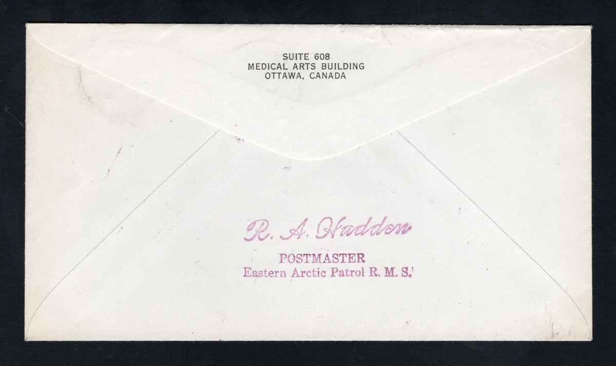 311 CVR   image1951 Pond Inlet N.W.T. to Ottawa via R.M.S. Canada. mailed on AUG.5.1951 (two Pond Inlet c.d.s.) to Ottawa, with an AUG.26 "Eastern Arctic Patrol R.M.S. / Canada" c.d.s. and a large AUG.26 oval "Eastern Arctic Patrol / R.M.S. Canada" in purple. Back has a purple "R.A. Hadden / Postmaster / Eastern Arctic Patrol R.M.S." handstamp, very fine. (Scan 1) (Scan 2) (All Scans) (All Images)