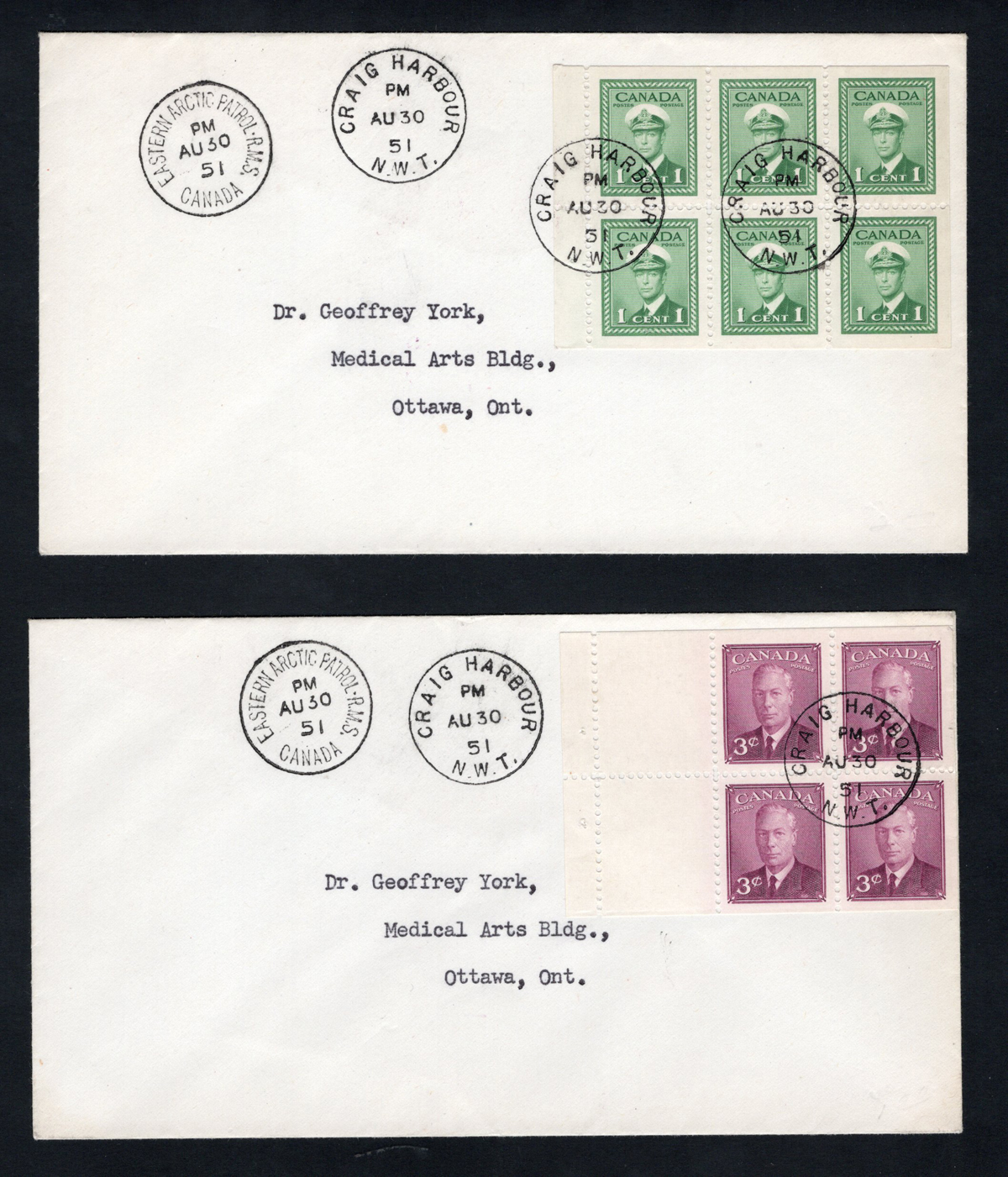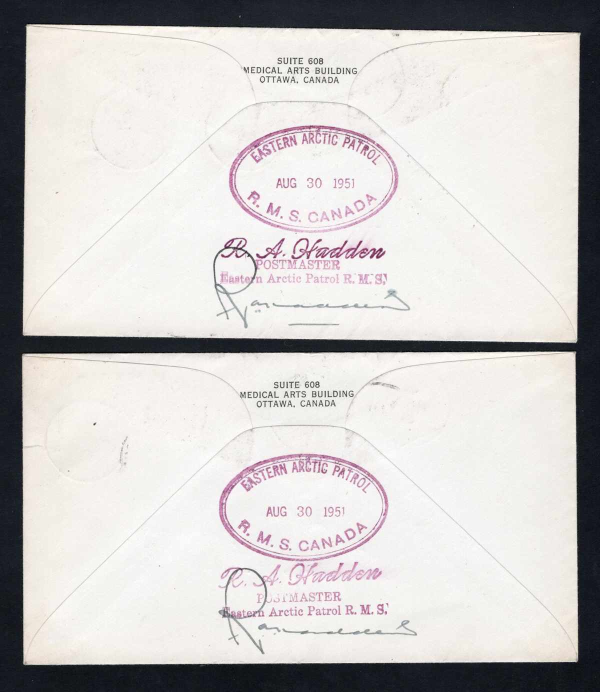 312 CVR   imageTwo 1951 Eastern Arctic Patrol / R.M.S. Canada Covers, both mailed from Craig Harbour on AUG.30.1951 (c.d.s.) to Ottawa, both with AUG.30 "Eastern Arctic Patrol R.M.S. / Canada" c.d.s. on front and large oval "Eastern Arctic Patrol / R.M.S. Canada" in purple on back, next to Postmaster handstamp and signature. Very fine. (Scan 1) (Scan 2) (All Scans) (All Images)