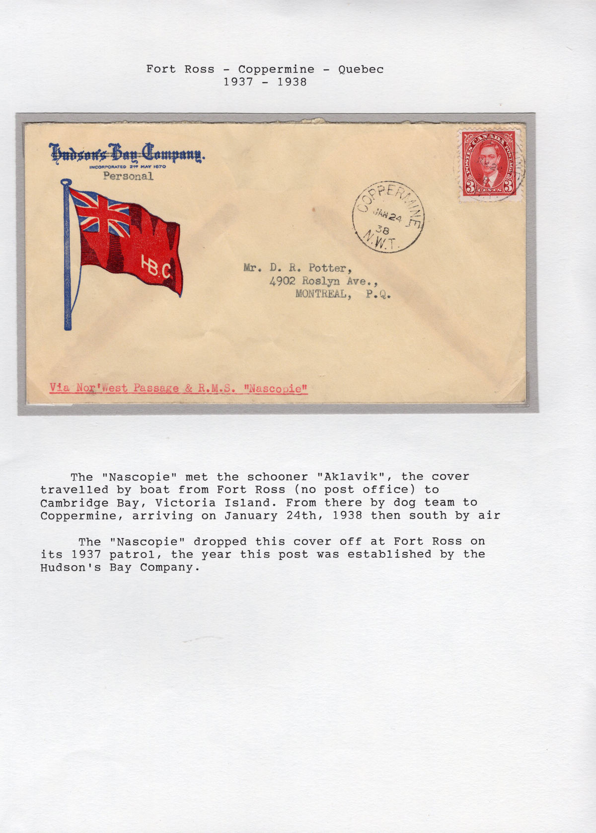 313 CVR   image1938 Coppermine N.W.T. to Montréal, via R.M.S. Nascopie, a Hudson's Bay Company flag illustrated cover mailed on JAN.24.1938 (two c.d.s., one tying stamp), with endorsement "via Nor'West Passage & R.M.S. Nascopie", very fine and written-up on a page.