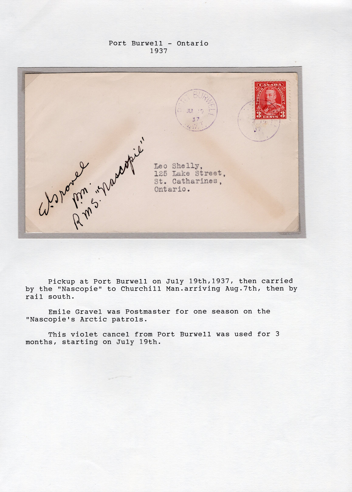 314 CVR   image1937 Port Burwell N.W.T. Cover to St. Catharines, Ont., via the R.M.S. Nascopie (manuscript), with signature of postmaster E. Gravel, very fine and written-up on an exhibit page.