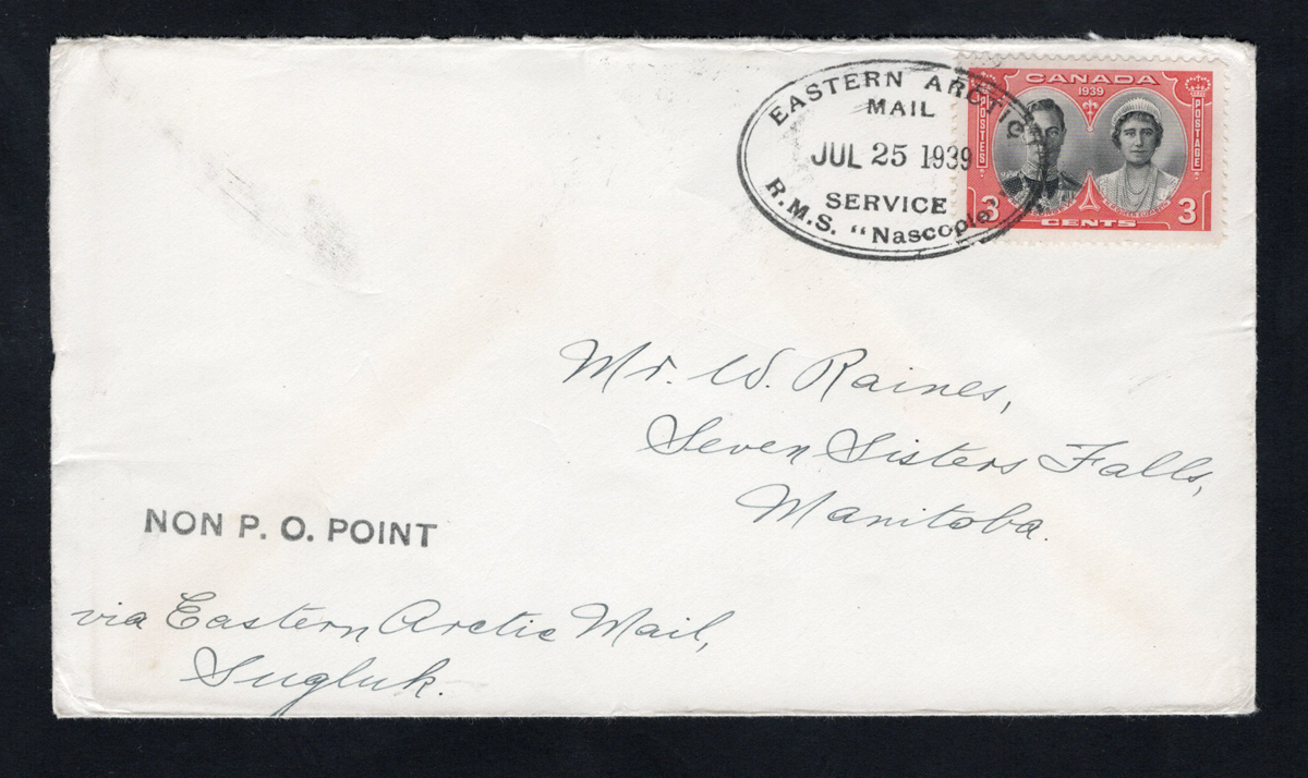 315 CVR   image1939 R.M.S. Nascopie Cover mailed "Non P.O. Point" handstamp to Seven Sisters Falls, Manitoba, postmarked on board with JUL.25.1939 oval "Eastern Arctic / Mail / Service / R.M.S. Nascopie" handstamp, picked up at Sugluk, northern Québec, very fine.