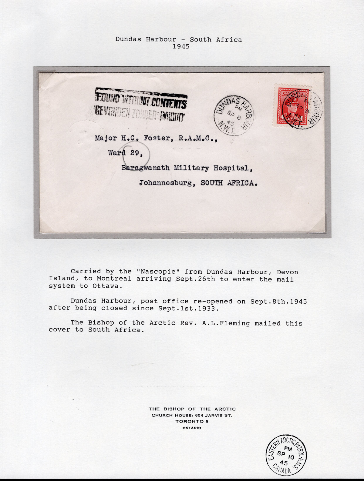 316 CVR   image1945 Dundas Harbour N.W.T. to South Africa via the R.M.S. Nascpie, a "Bishop of the Arctic Church House / Toronto" cover mailed on SEP.8.1945 (two c.d.s. strikes) to Johannesburg, South Africa, with a SEP.10 "Eastern Arctic Patrol R.M.S. / Canada" c.d.s. on back, and a "found without contents" bilingual receiver, very fine.