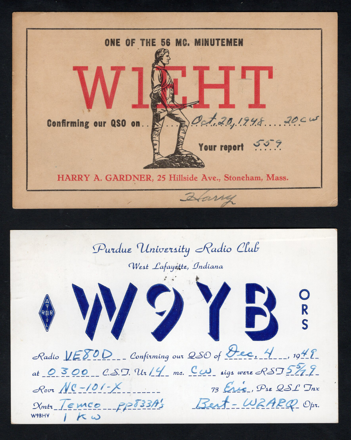 317 PC   imageTwo QSL Cards Mailed to Clyde River, N.W.T., both mailed from the United States in 1949 to Clyde River, each with a small boxed "Eastern Arctic / Patrol / date / R.M.S. Canada" handstamps, very fine. (Scan 1) (Scan 2) (All Scans) (All Images)