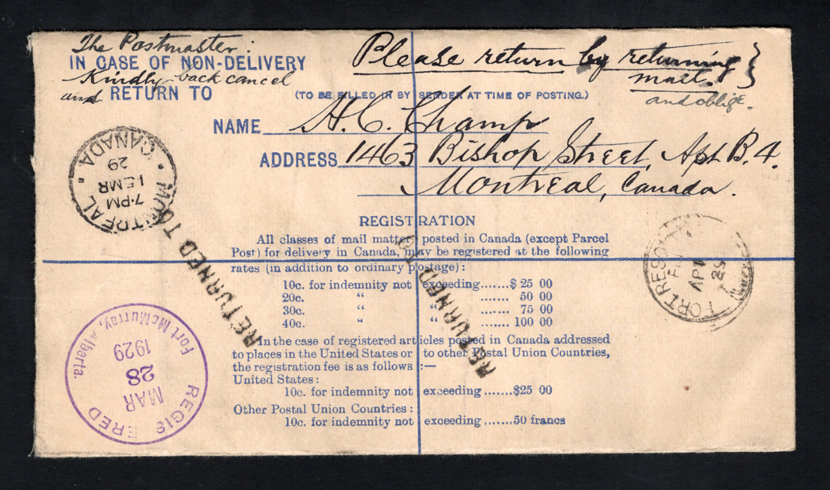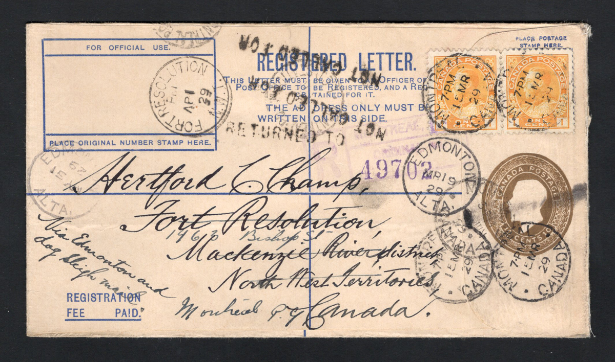 309 CVR   image1929 Registered Stationery Cover to the Mackenzie River District, a 10c brown KGV stationery envelope uprated with two 1c Admirals mailed from Montréal on MAR.15.1929, addressed to Fort Resolution, Mackenzie River district, Northwest Territories (APR.1 receivers) via Fort McMurray Alberta (MAR.28 transit) and Edmonton (MAR.31 transit), endorsed "via Edmonton and Dog Sleigh mail". Address crossed-out, "not called for" and "return to" handstamps applied and cover returned to Montréal. Very fine and interesting cover. (Scan 1) (Scan 2) (All Scans) (All Images)