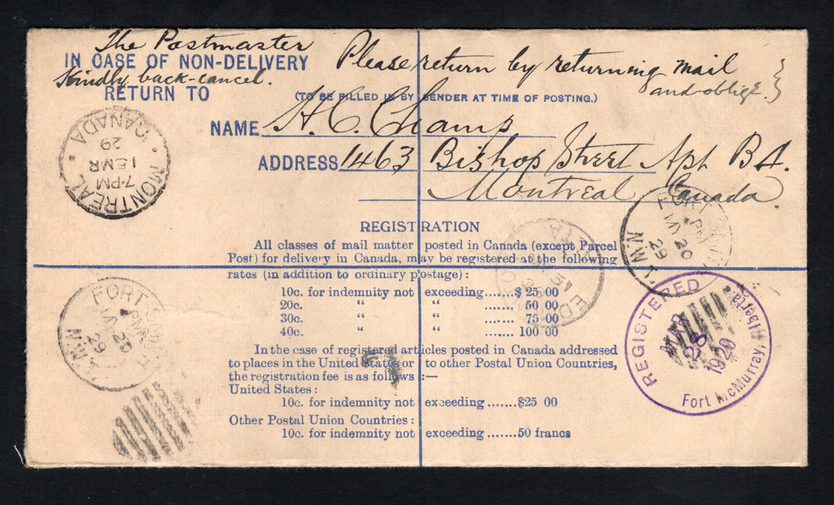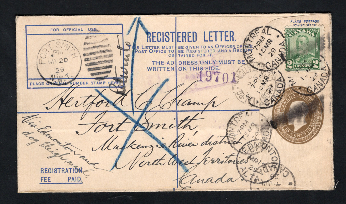 310 CVR   image1929 Registered Stationery Cover to the Mackenzie River District, a 10c brown KGV stationery envelope uprated with a 2c Scroll mailed from Montréal on MAR.15.1929, addressed to Fort Resolution, Mackenzie River district, Northwest Territories (no receiver) via Fort McMurray Alberta (MAR.28 transit), Fort Smith (MAY.20 duplex transits) and Edmonton (MAR19 and MAY.31 transits), endorsed "via Edmonton and Dog Sleigh mail". Address crossed-out in blue crayon, with manuscript "Return to" and blue arrow pointing to return address in Montréal (JUN.4 receiver). Very fine and interesting cover. (Scan 1) (Scan 2) (All Scans) (All Images)