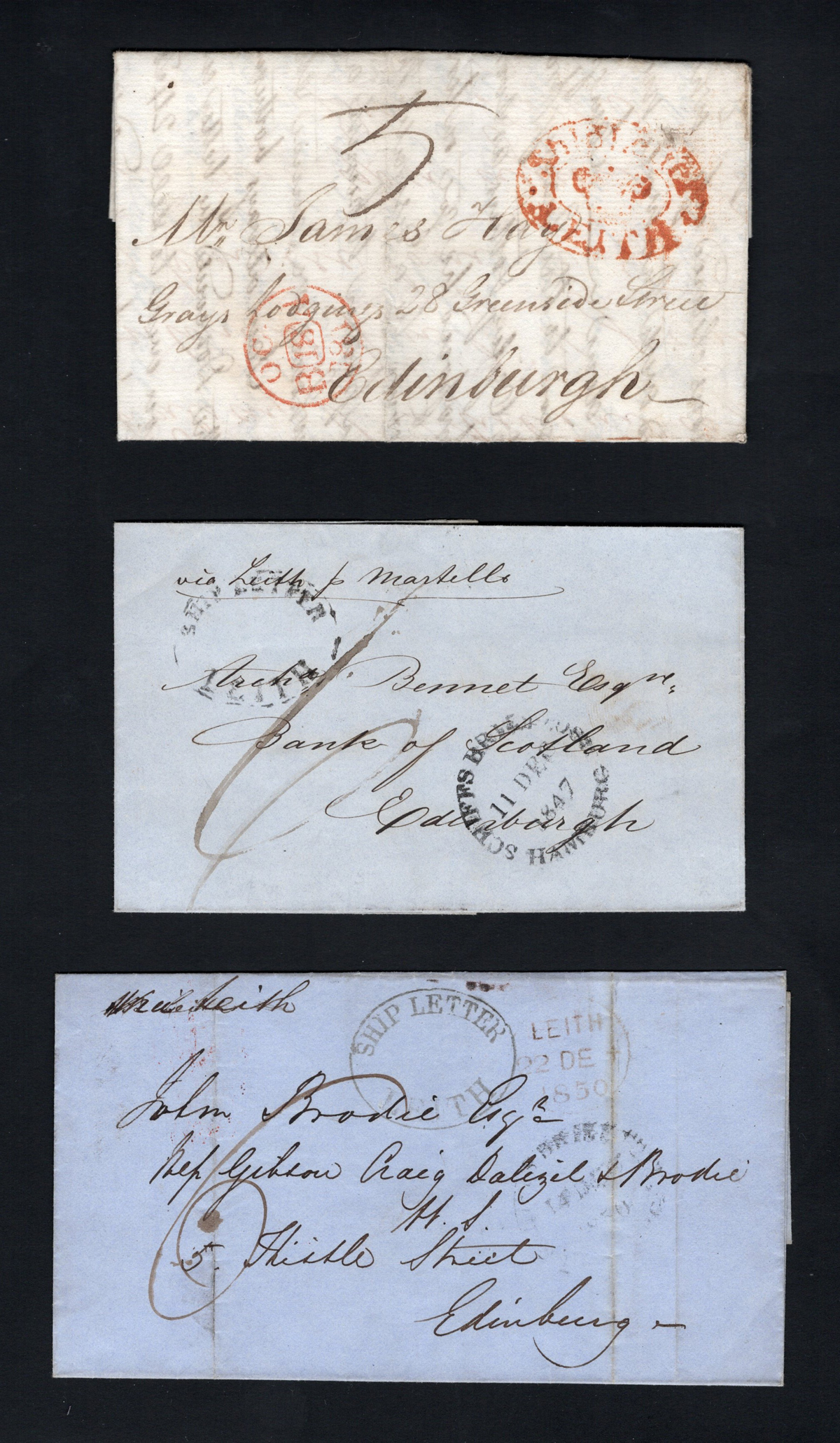402 CVR   image1811-1850 Trio of Folded Letters with Leith Ship Letter Postmarks, first is datelined OCT.7.1811with "Ship Letter / Crown / Leith" double oval in red to Edinburgh, second (no letter inside) was mailed on DEC.11.1847 with "Schiffs Briefpost / Hamburg" datestamp to Edinburgh with oval :Ship Letter / Leith" in black (Auckland #ED392) and third (no letter inside) was mailed in December 1850 with "Schiffs Briefpost / Hamburg" datestamp to Edinburgh, with oval "Ship Letter / Leith" in black (Auckland #ED392) and Leith DEC.22.1850 datestamp in red. Overall fine to very fine trio.