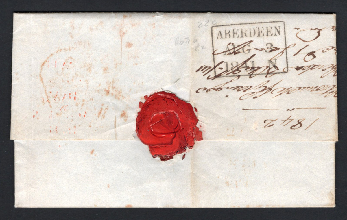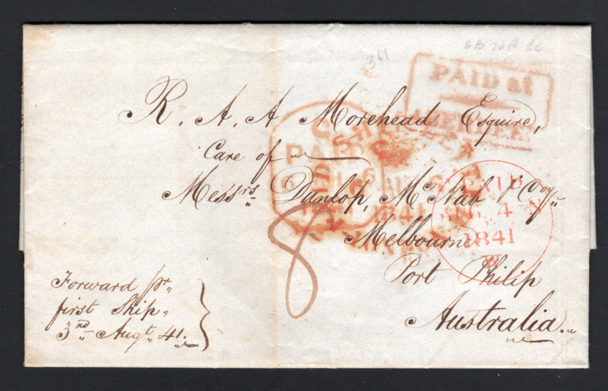 403 CVR   image1841 Folded Letter Scotland to Australia, the letter inside is datelined Aberdeen AUG.3.1841, addressed to Melbourne / Port Philip / Australia. Back shows a boxed "Aberdeen / Aug 3 / 1841 N" datestamp in black and front shows a boxed "Paid at / Aberdeen" handstamp in red. Front also shows three datestamps in red: one dated AUG.4 (in circle with PAID), one resembling a tombstone with PAID and unreadable date and a third reading "Paid Ship Letter / London" dated AUG.6. Very fine. (Scan 1) (Scan 2) (All Scans) (All Images)