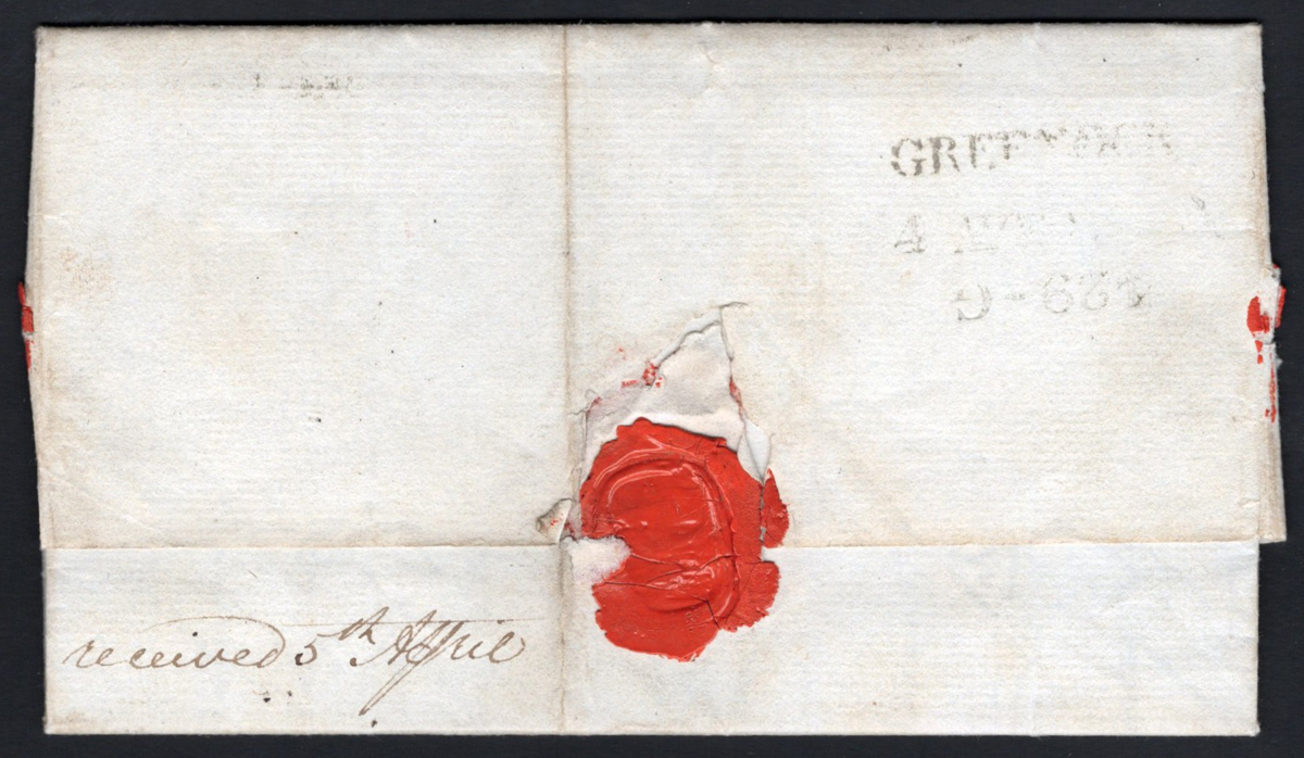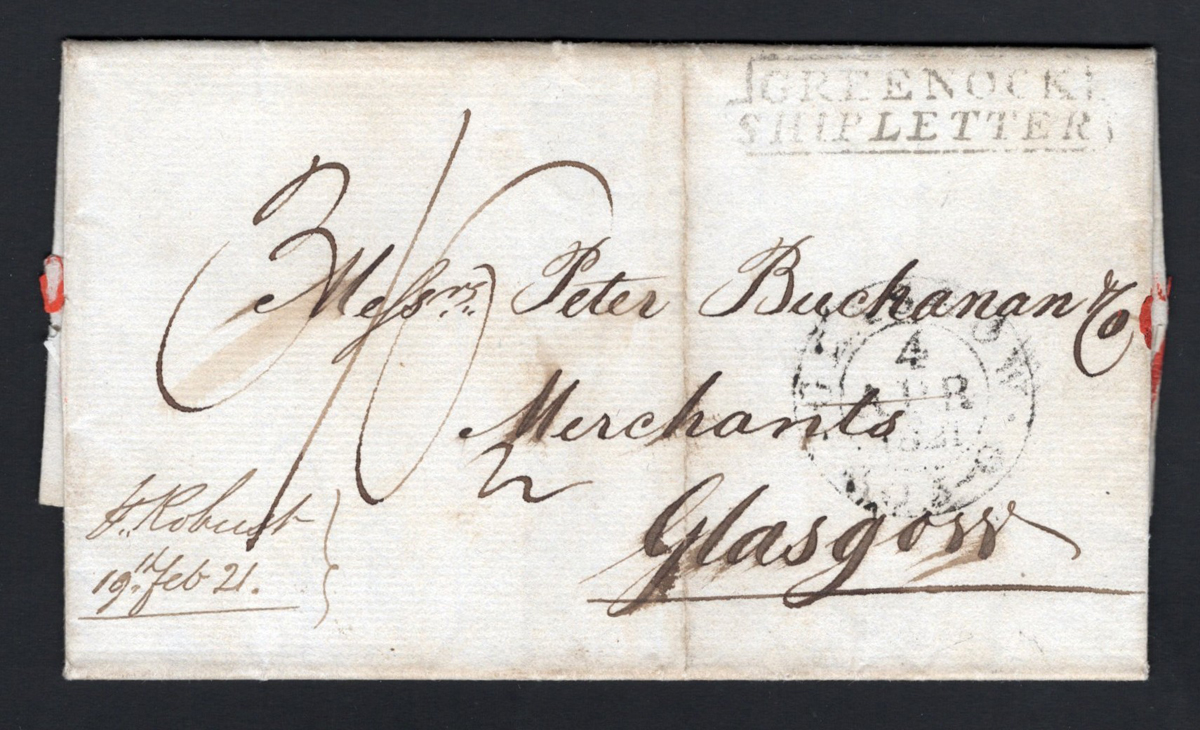 404 CVR   image1821 Folded Letter Guiana to Scotland, the letter(s) inside are datelined Demerary February 15 and 19, 1821, addressed to Glasgow, with a boxed "GREENOCK / SHIP LETTER" handstamp, "GREENOCK / 4 MAR . 429 G" handstamp and double circle APR.4.1821 Glasgow receiver. Overall fine and an interesting cover from this country, which was in-between occupancy of the Dutch and the English in the period just before it became the colony of British Guiana in 1831. (Scan 1) (Scan 2) (All Scans) (All Images)