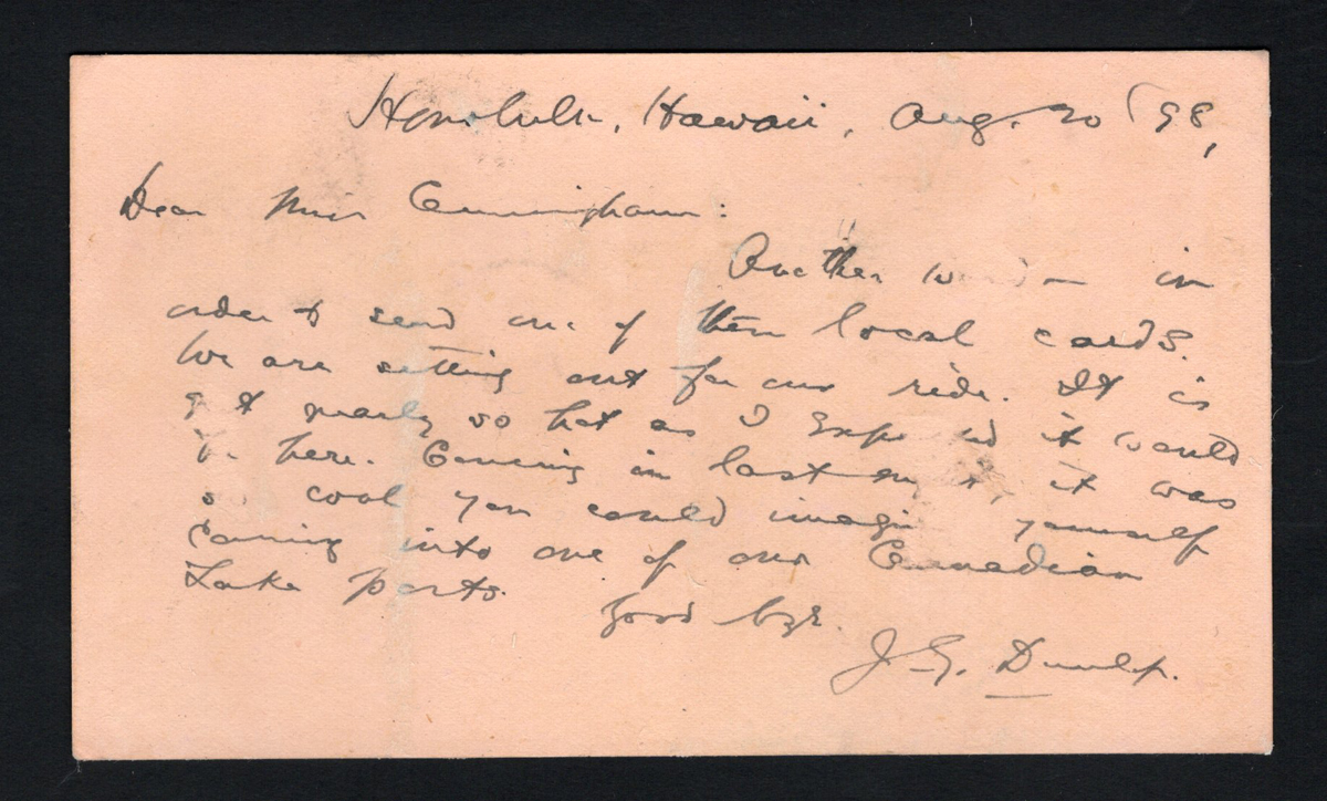405 PC   image1898 Hawaii Uprated U.P.U. Stationery Card to Japan, a 2c Higgins & Gage #14 card uprated to 3c with a 1c Scott #74 was mailed from Honolulu on AUG.20.1898 (#2 duplex cancel) to Karuizawa Japan, via Yokohama (transit c.d.s. on front), very fine and scarce. (Scan 1) (Scan 2) (All Scans) (All Images)