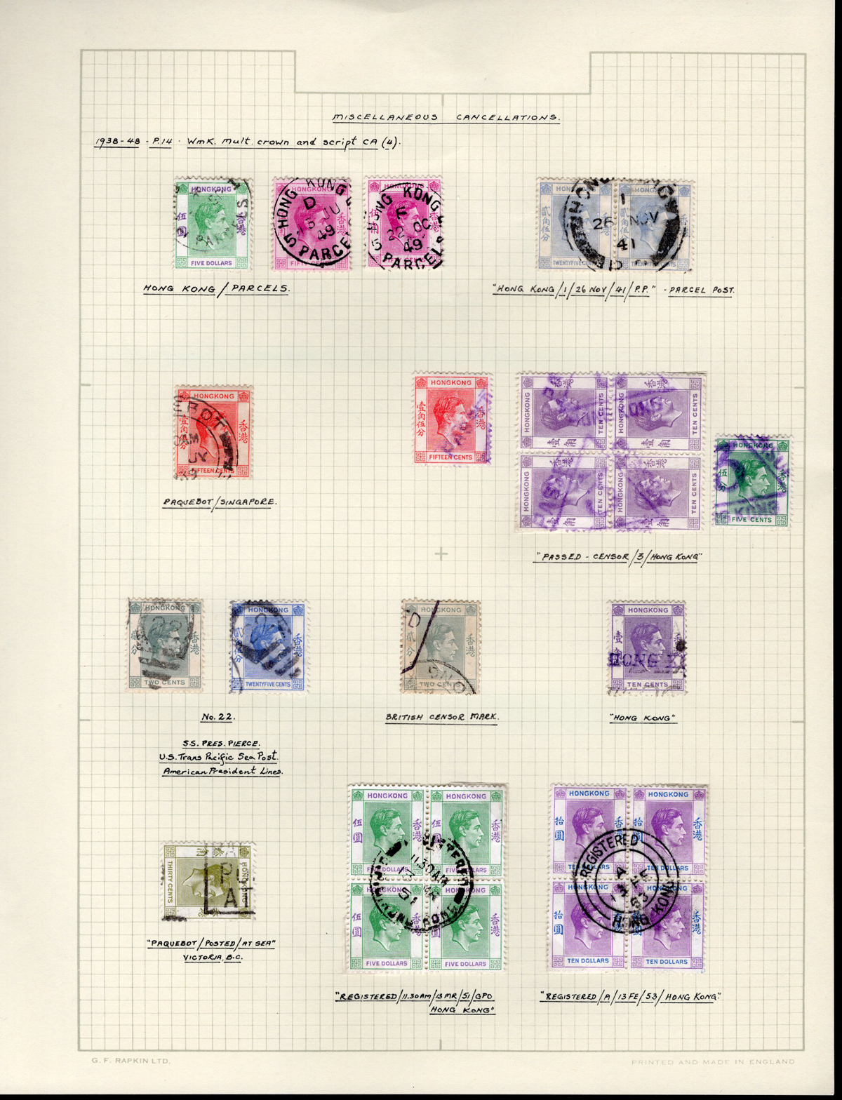 406 O   imagePage of Hong Kong KGVI Stamps with Various Postmarks, includes 12 singles, a pair and three blocks of four, noting registration postmarks, censorship triangles, paquebot, parcel post, etc. Very fine.