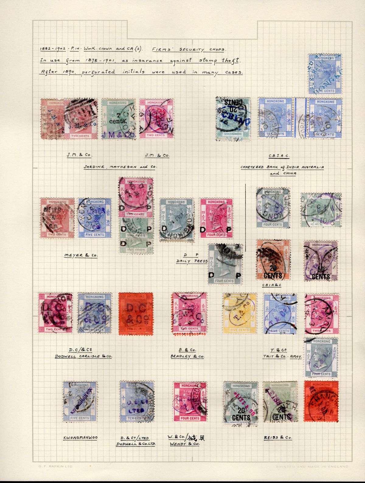409 O   imagePage of Queen Victoria Stamps with Firms’ Security Chops, 5 stamps show 5 different firms. These were used to prevent stamp theft, many were replaced by perfins after 1890, very fine.