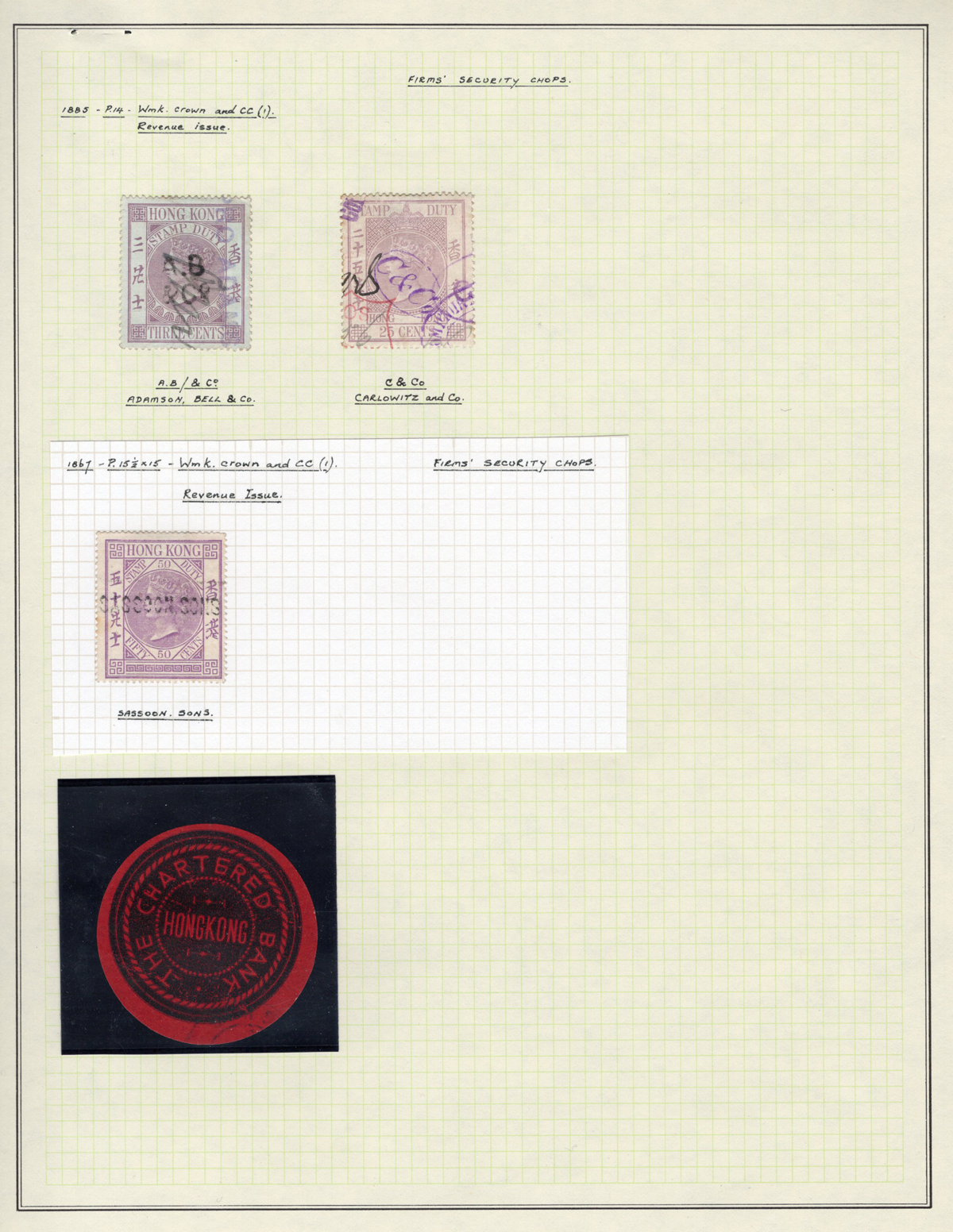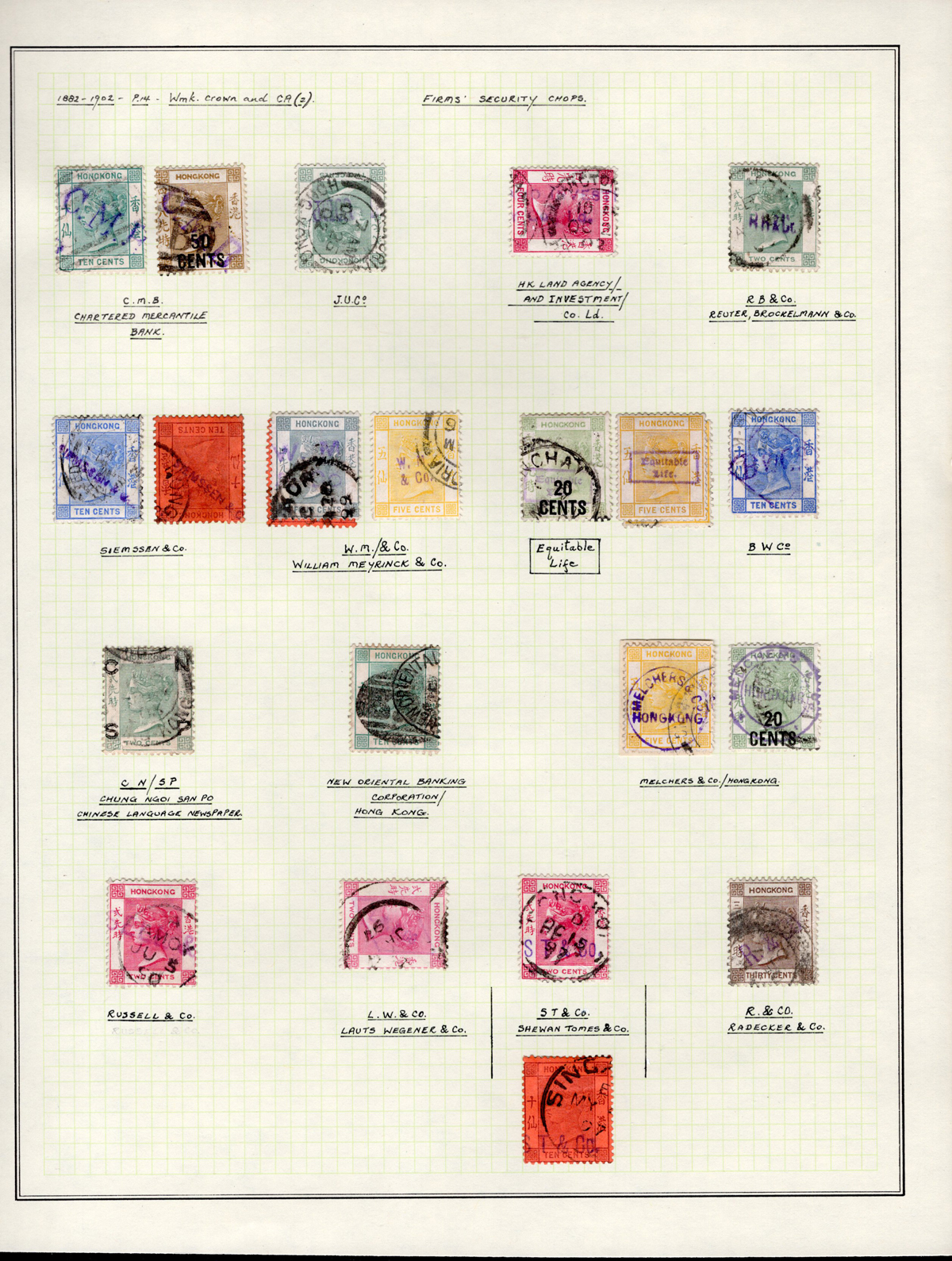 411 O   imagePage of Queen Victoria Stamps with Firms’ Security Chops, 23 stamps show 15 different firms. These were used to prevent stamp theft, many were replaced by perfins after 1890, very fine. 50
