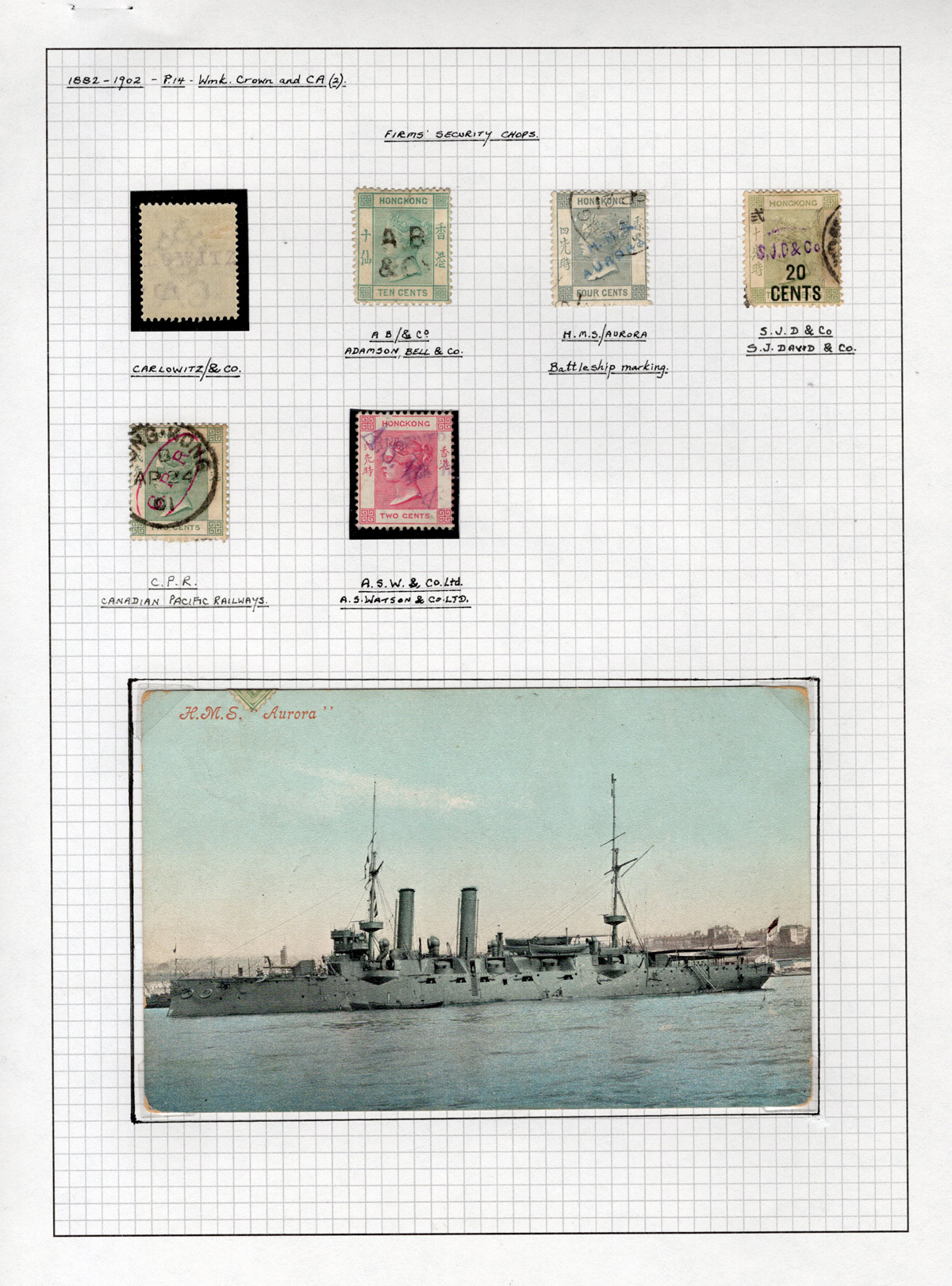 419 O/PC   image2 Pages of Queen Victoria Stamps with Firms’ Security Chops, 6 postage stamps plus three revenue stamps show 6 different firms, and also includes a picture postcard of the “H.M.S. Aurora” whose chop is on one of the stamps, very fine. (Scan 1) (Scan 2) (All Scans) (All Images)