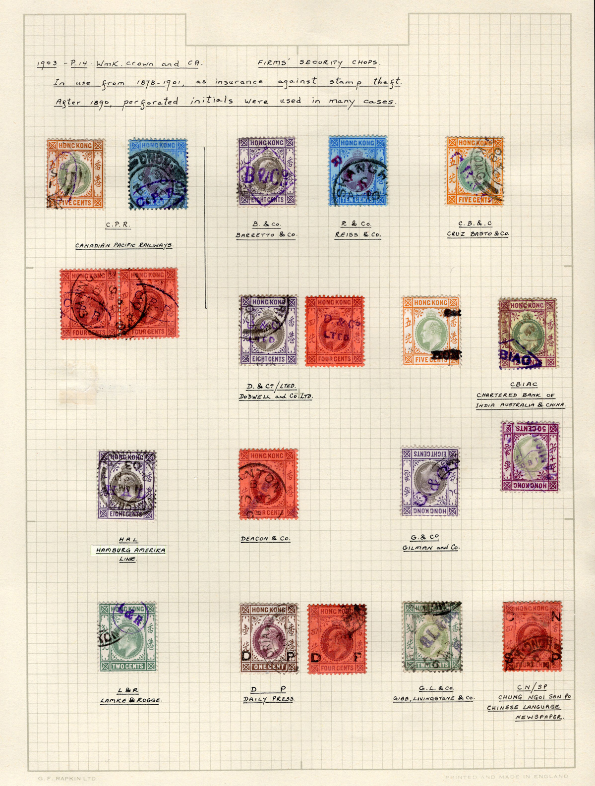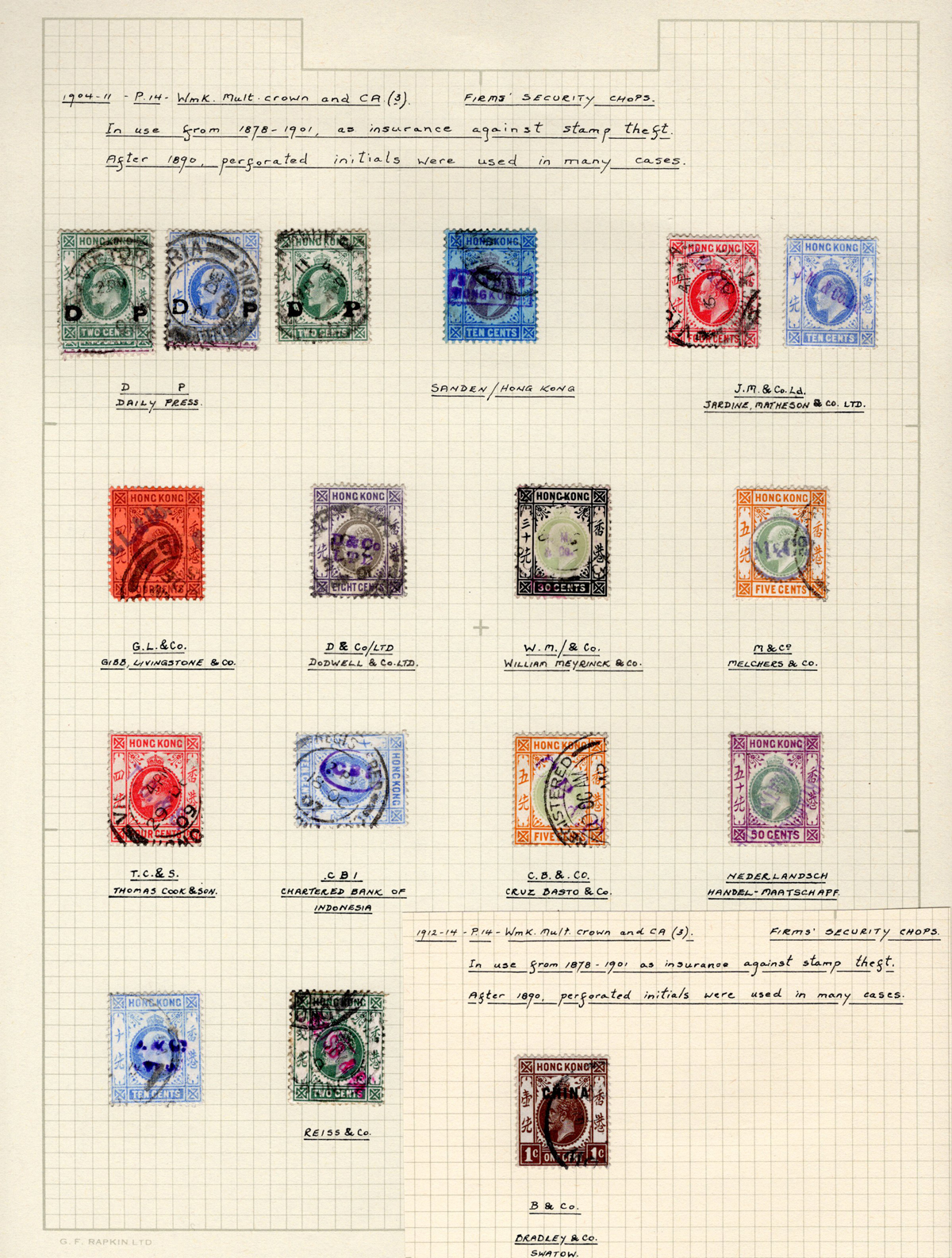 413 O   imagePage of King Edward VII Stamps with Firms’ Security Chops, 17 stamps show 13 different firms. These were used to prevent stamp theft, very fine.